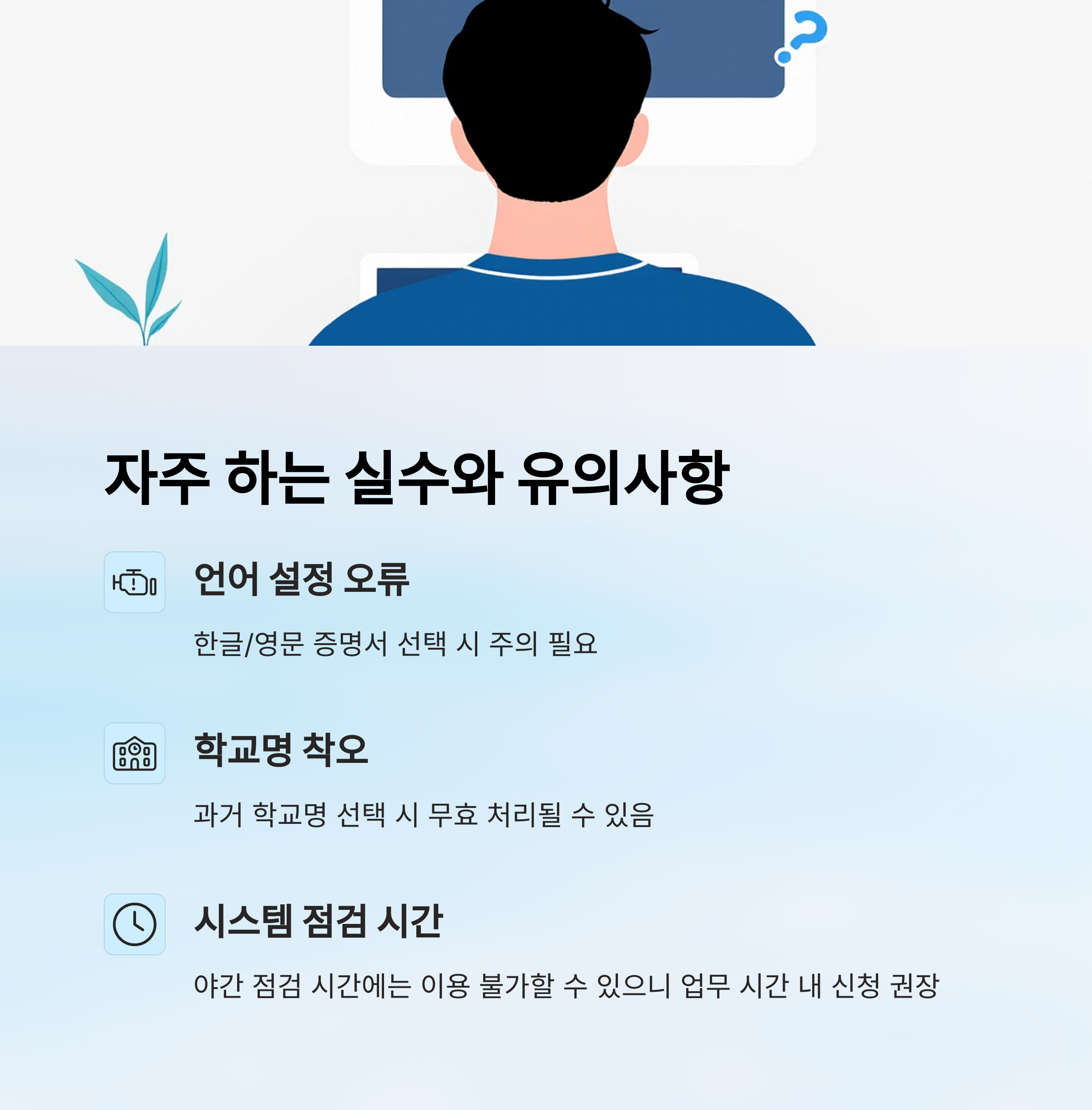 가끔 졸업증명서 발급할 때 실수하는 경우가 있어요. 예를 들어, 잘못된 언어(한글/영문)로 신청하거나, 과거 학교명을 선택해서 무효 처리되는 일이 종종 생기죠.