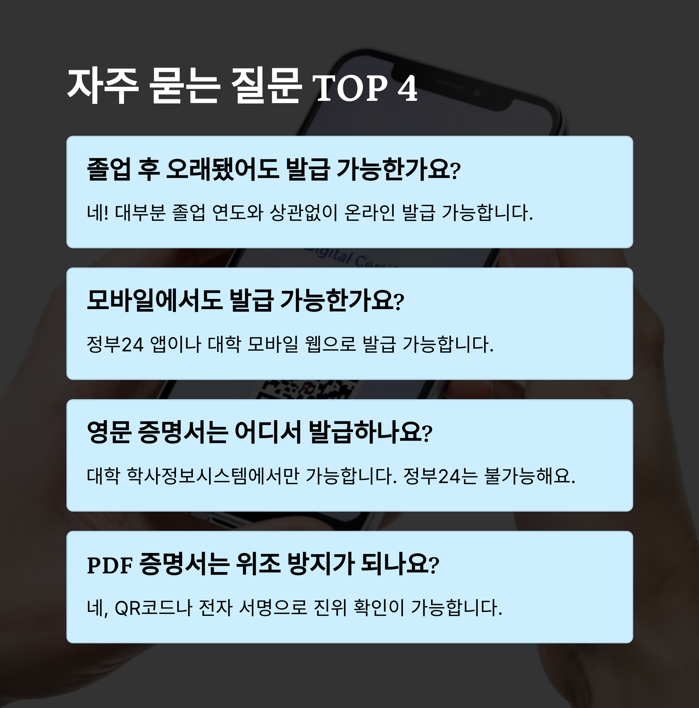 A2. 정부24 앱이나 대학교의 모바일 웹 시스템을 통해 모바일 발급이 가능해요. PDF 저장, 이메일 제출까지 모두 편하게 이용할 수 있어요.