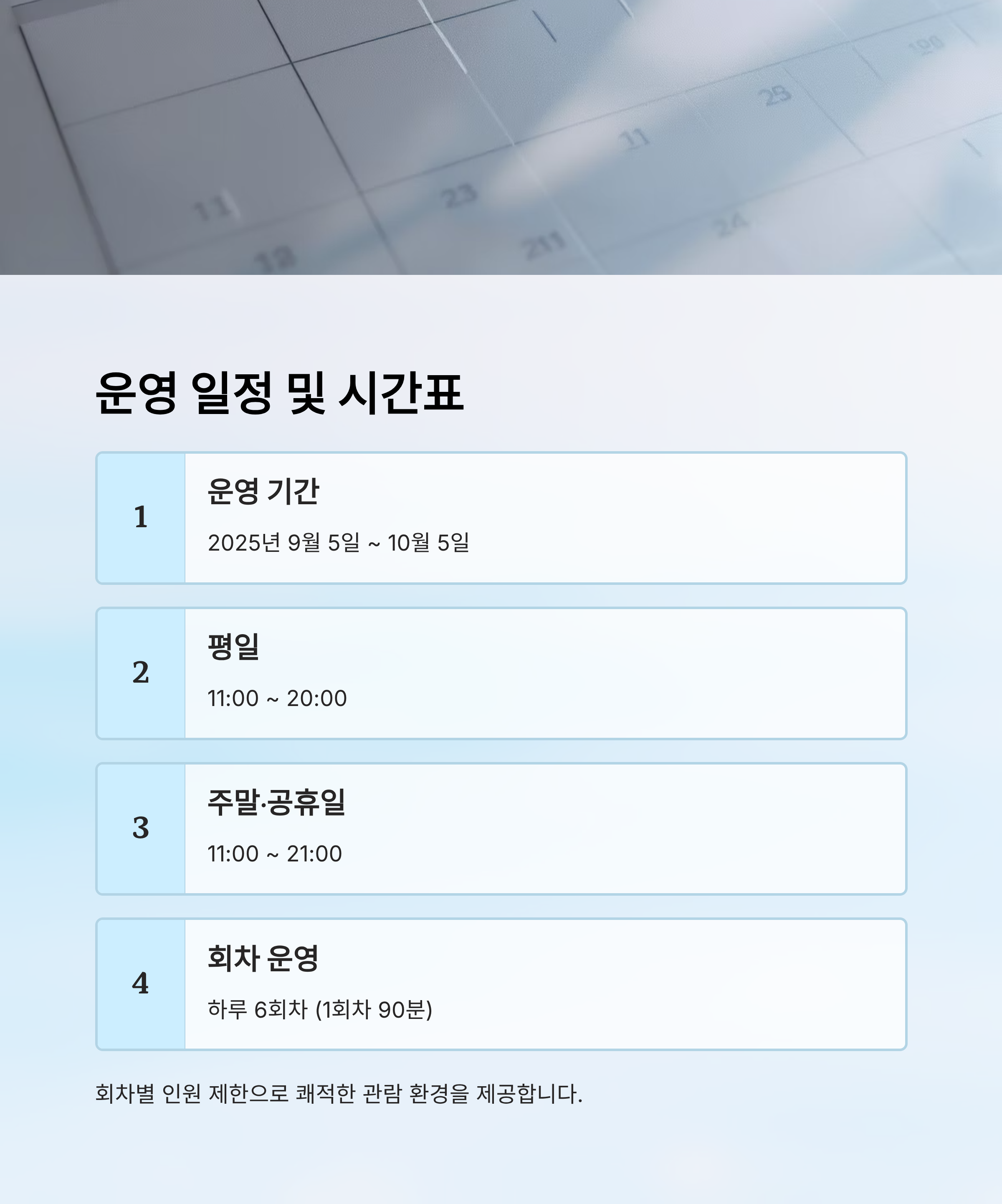 팬들이 이해하기 쉽도록 운영 일정과 회차별 시간을 정리한 표를 준비했어요. 이걸 참고하면 예약할 때 도움이 될 거예요. ⏰