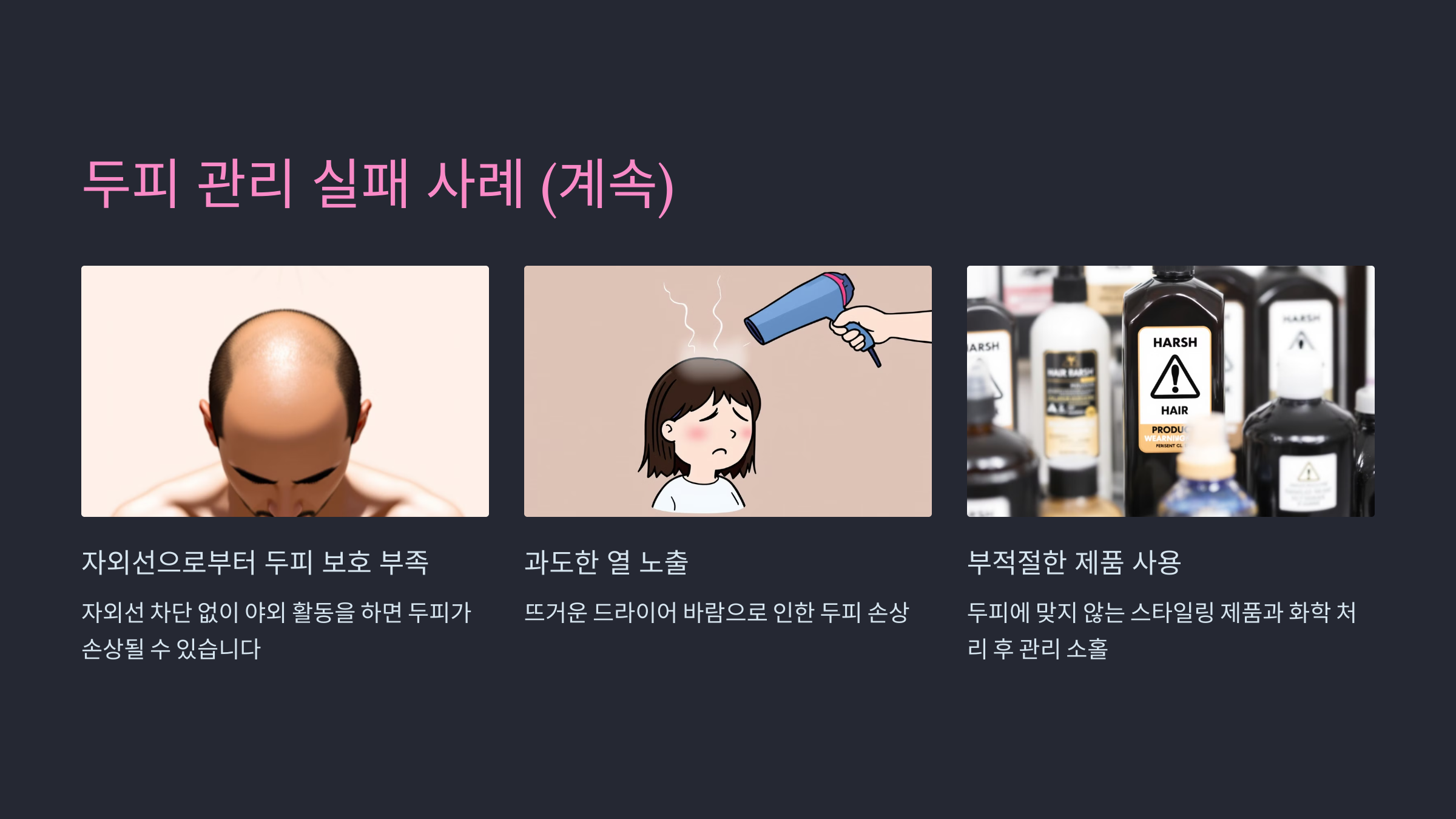 - 결과: 피지 과잉 분비, 건조증, 각질 증가 등 두피 상태 악화.