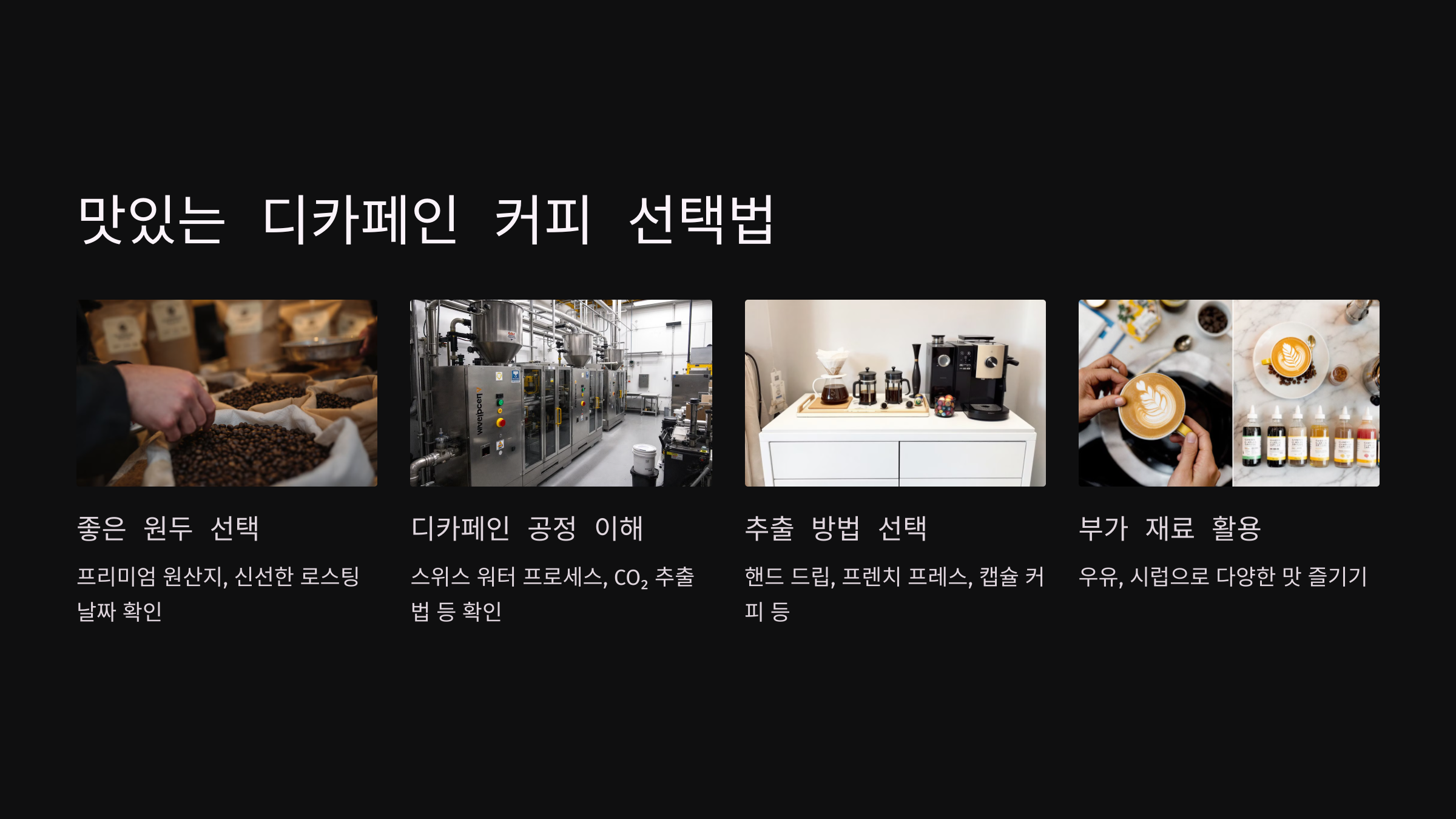 - 스위스 워터 프로세스: 화학물질 대신 물을 사용해 카페인을 제거하는 친환경 공법으로, 커피 본연의 맛을 보존합니다.