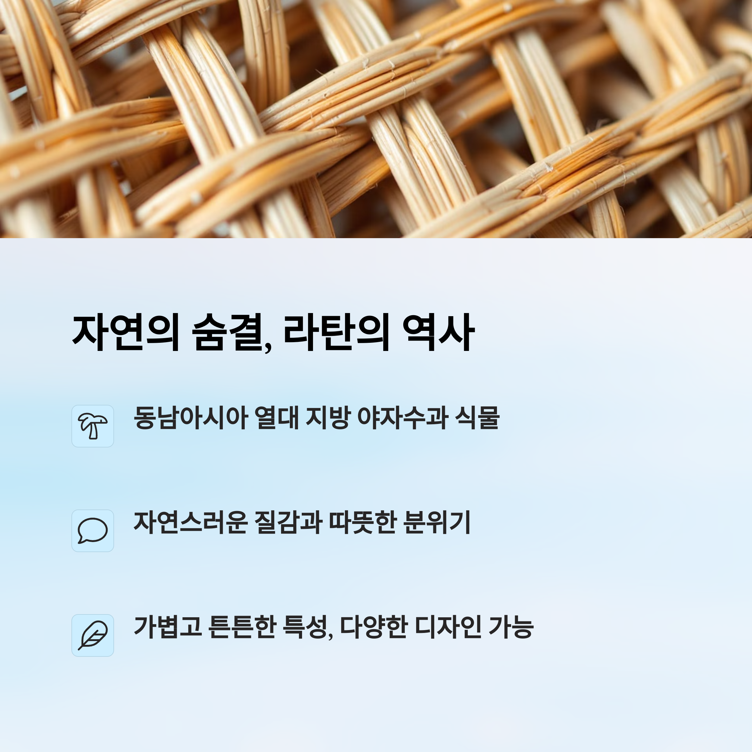 라탄은 자연 소재 특유의 따스함과 질감 덕분에 많은 사람들에게 사랑받는 인테리어 요소예요. 최근에는 북유럽 감성, 보헤미안 스타일, 내추럴 홈스타일 등에 빠지지 않고 등장하는 소품이죠.