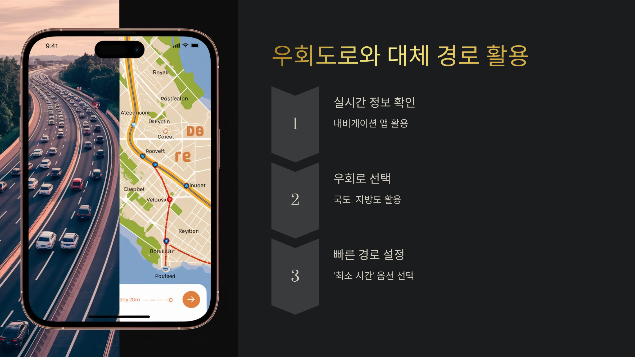 T맵, 카카오내비 같은 내비게이션 앱에서는 실시간 교통 상황을 반영해 가장 빠른 우회 경로를 추천해줘요. 고속도로 출입구 인근의 교통량을 미리 분석해 우회도로로 진입할 최적의 시점을 알려주는 기능도 있어요. 이를 적극적으로 활용하면, 정체를 최소화할 수 있어요.