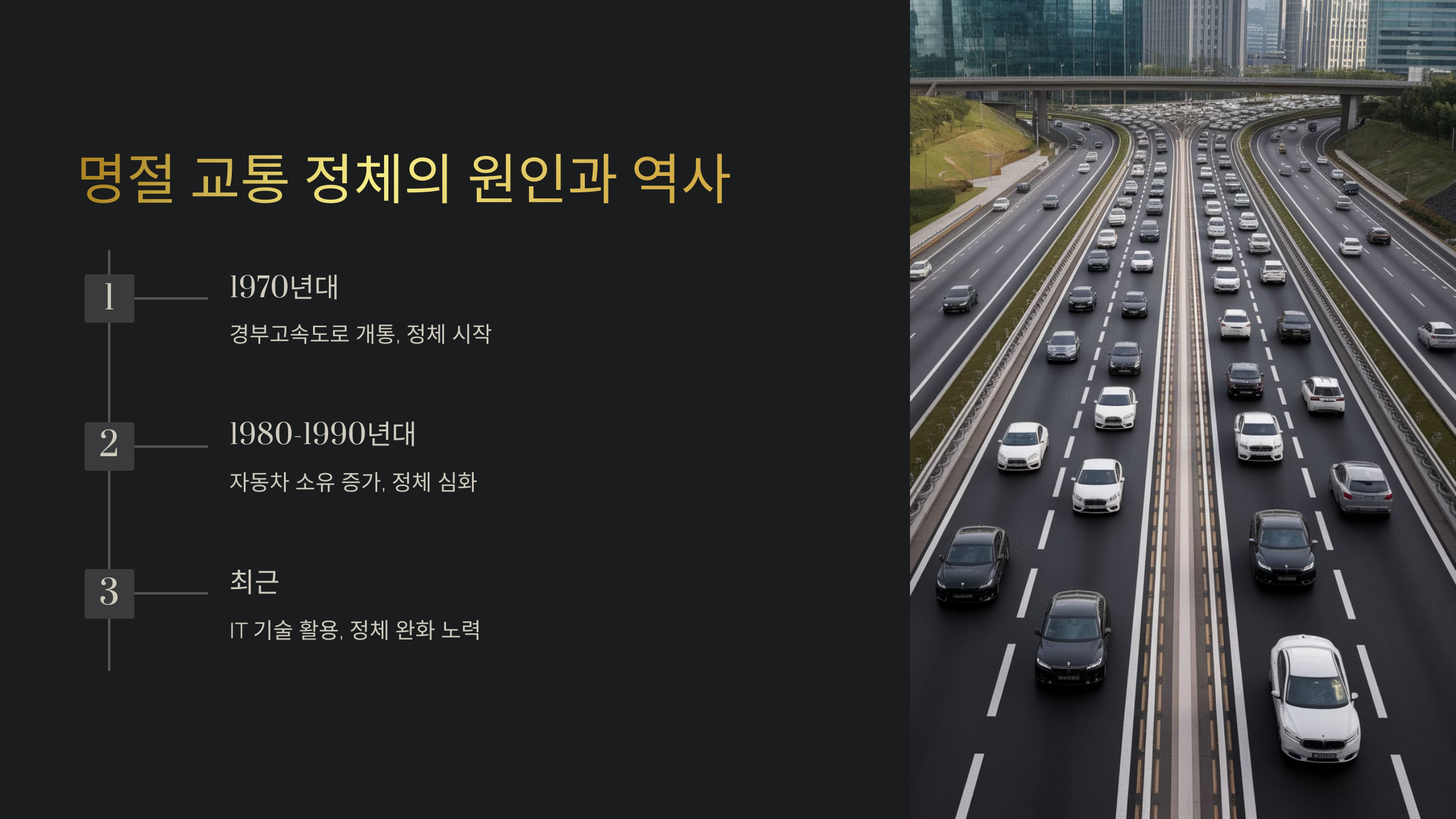 명절 교통 정체의 역사는 1970년대 경부고속도로 개통과 함께 시작되었다고 볼 수 있어요. 당시에는 차량 보급률이 지금보다 낮았음에도 불구하고, 귀성객들이 주요 노선에 집중되면서 정체 문제가 나타났어요. 이후 1980~1990년대에 자동차 소유가 급격히 늘어나면서 명절 교통 체증은 국민적 화두가 되었답니다.