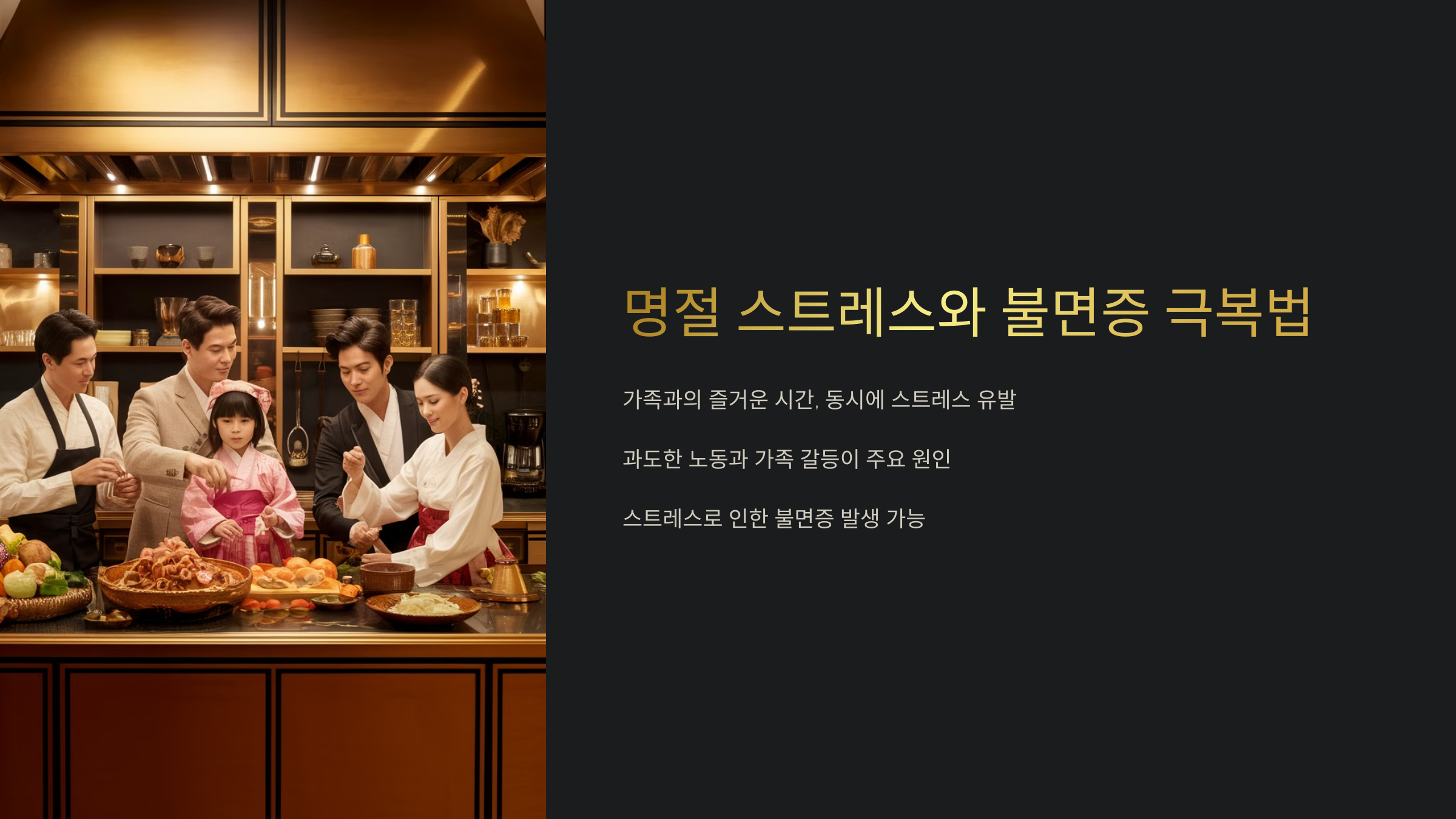 명절은 가족과 함께 시간을 보내고 즐거운 추억을 쌓는 시간이지만, 많은 사람들에게는 스트레스를 유발하는 시기로도 여겨져요. 특히 명절 준비로 인한 과도한 노동과 가족 간의 갈등은 명절 스트레스의 주요 원인이 된답니다. 명절 기간 동안 누적된 스트레스는 불면증으로 이어질 수 있어요.