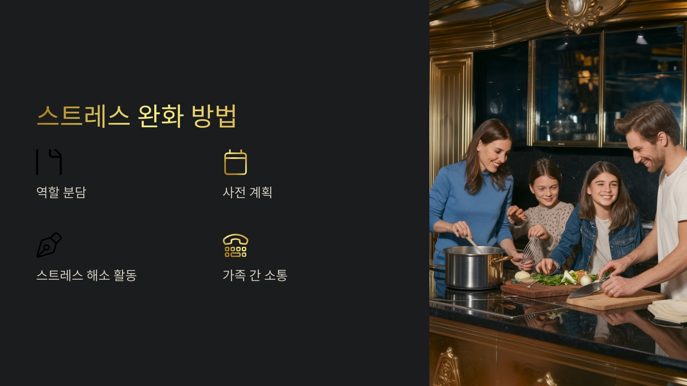 명절 스트레스를 완화하기 위해서는 작은 변화부터 시작해 보세요. 첫 번째로, 역할 분담을 통해 한 사람에게 모든 부담이 집중되지 않도록 해야 해요. 명절 음식 준비, 장보기 등 주요 작업을 가족들과 나눠 맡으면 신체적 부담이 줄어들어요.