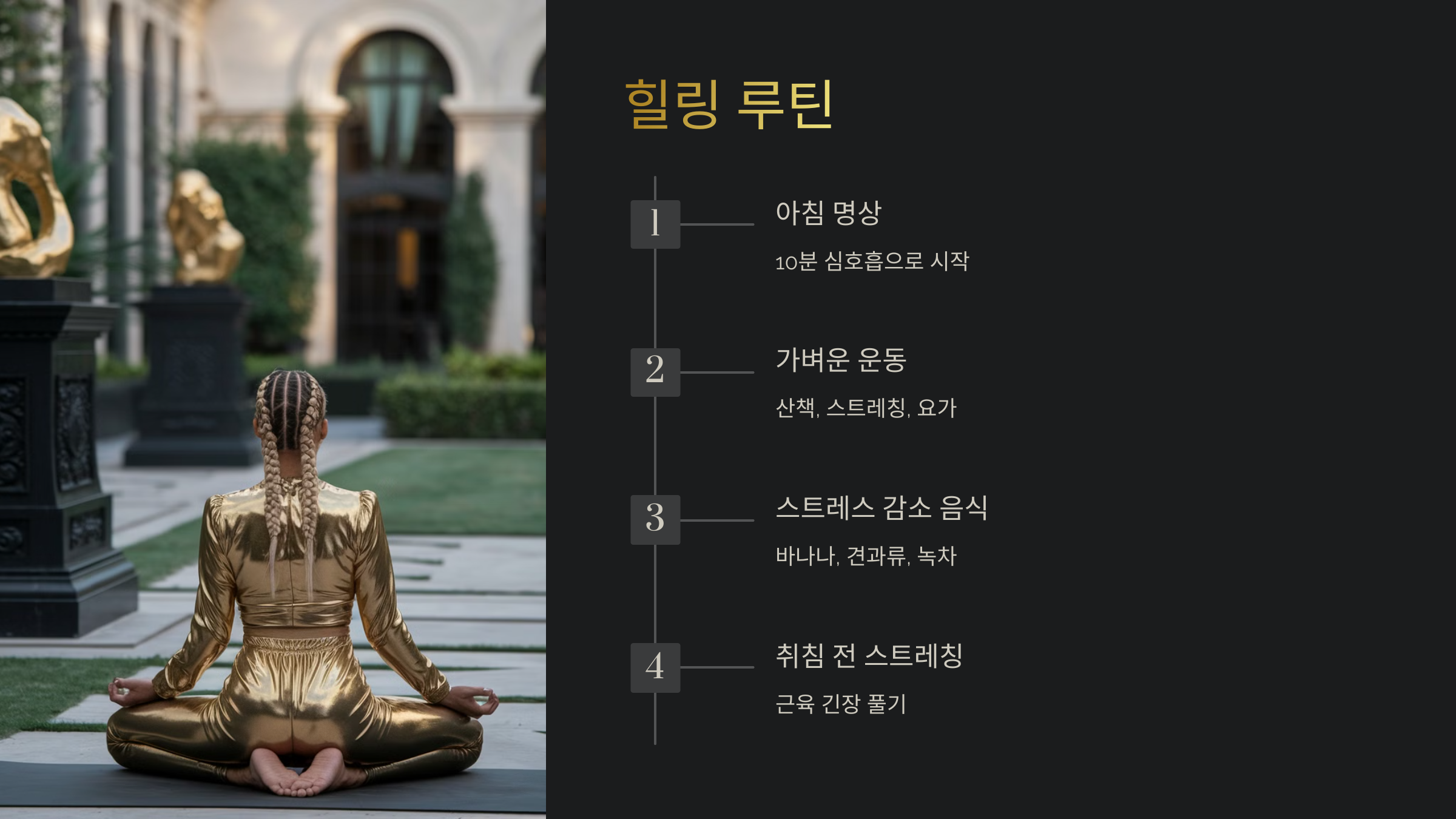 힐링 루틴에는 음식도 중요한 요소로 포함돼요. 스트레스를 줄이는 데 도움을 주는 음식, 예를 들어 바나나, 견과류, 녹차 같은 음식들을 섭취해 보세요. 이러한 음식들은 마음을 안정시키고, 수면 호르몬인 멜라토닌 분비를 촉진해 준답니다.