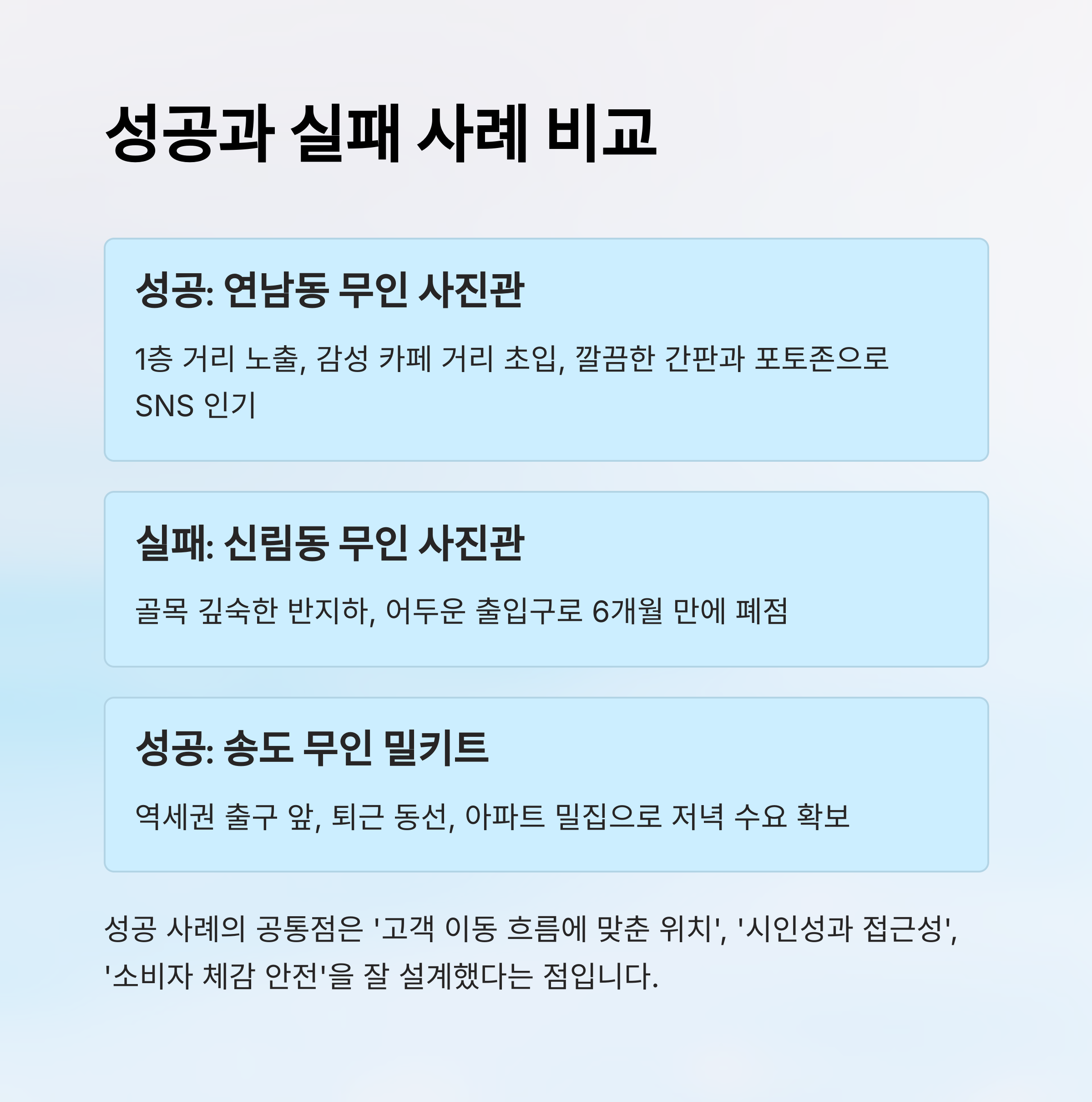 무인 창업에서 입지의 차이는 곧 성공과 실패를 가르는 핵심 포인트예요. 이번에는 실제 사례를 통해 어떤 점포가 어떤 이유로 성공했고, 반대로 실패했던 이유는 무엇이었는지 구체적으로 비교해볼게요!