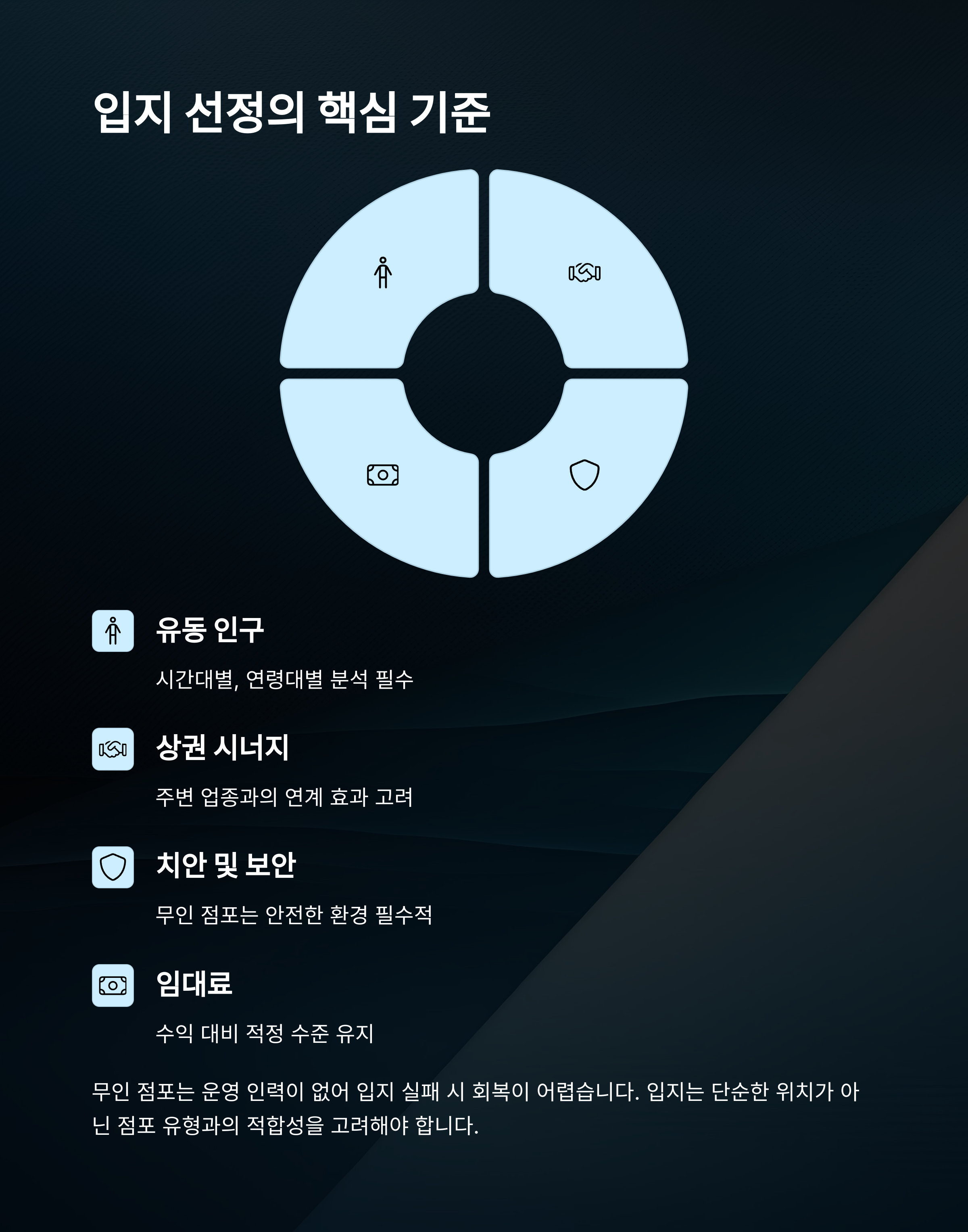 무인 창업에서 가장 중요한 것이 바로 입지예요. 운영 인력이 없기 때문에 입지에서 실패하면 회복이 어렵죠. 입지 선정은 단순히 위치가 좋은 것뿐 아니라, 해당 위치가 점포 유형과 잘 맞는지, 고객의 행동 패턴과 맞물리는지를 분석해야 해요.