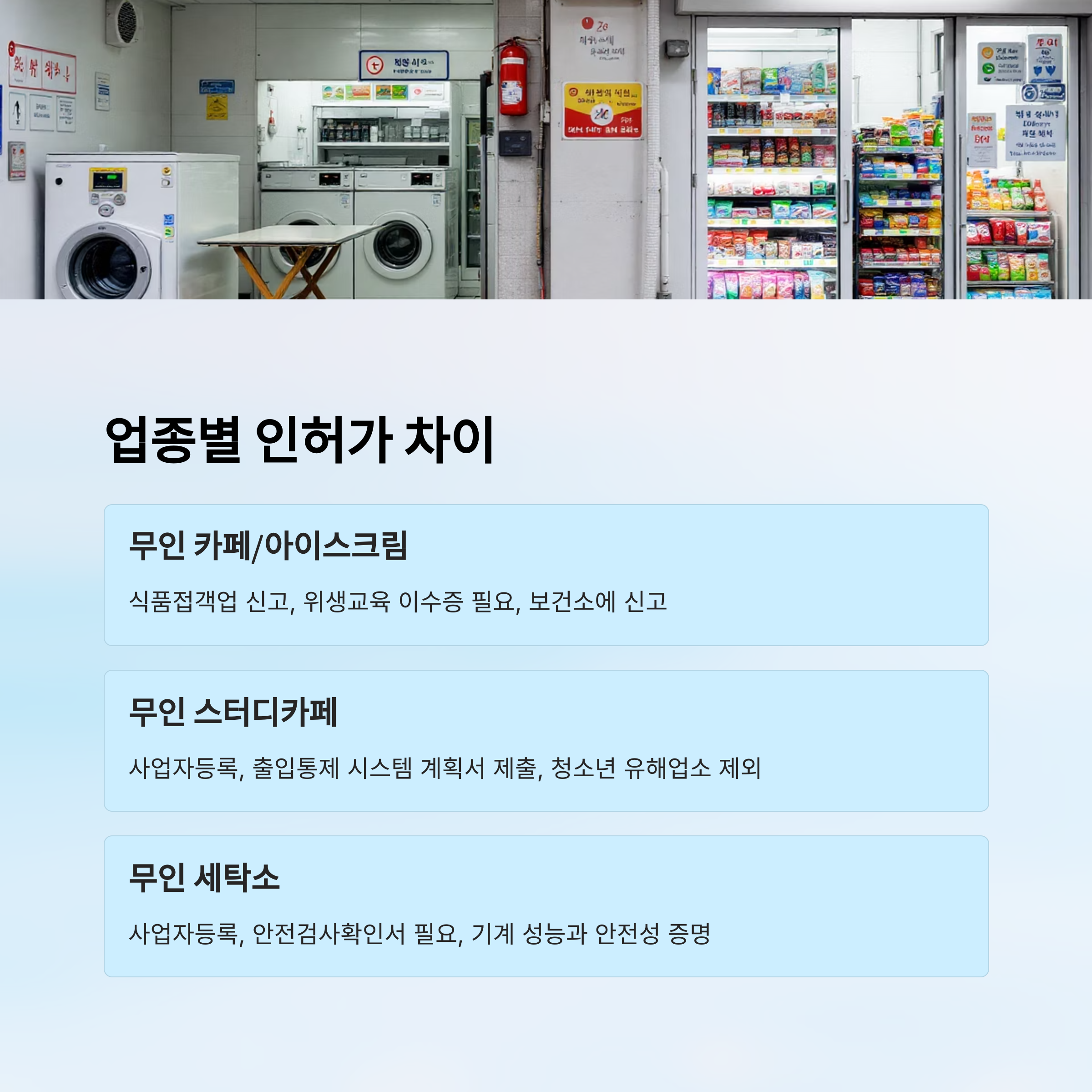| 무인 세탁소 | 사업자등록, 안전검사확인서 | 지자체 |