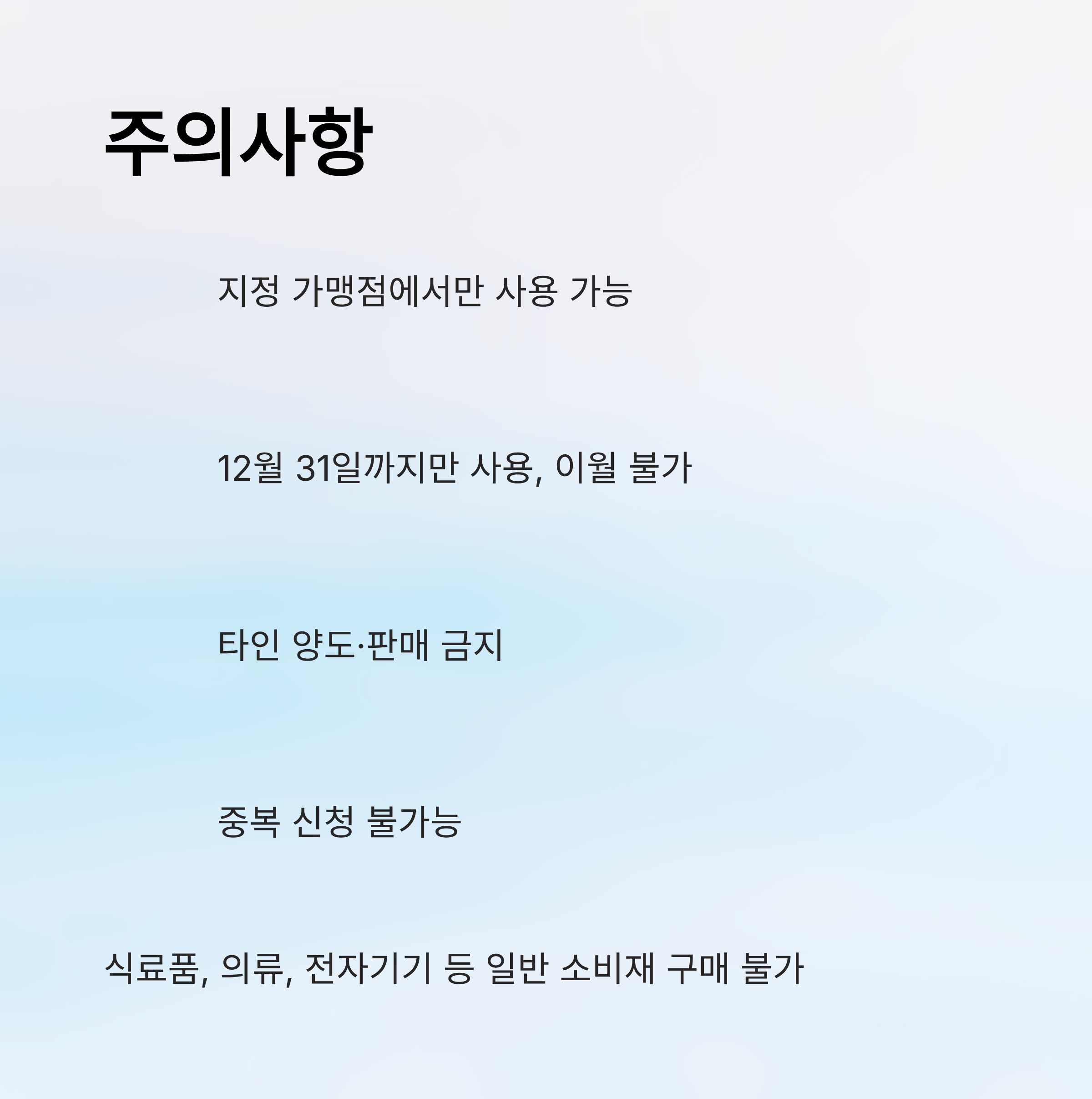 또 하나의 팁은 타인에게 양도나 판매도 금지돼 있다는 점이에요. 카드의 부정 사용이 적발되면 다음 해 지원이 제한되거나 법적 제재가 있을 수 있으니 반드시 본인만 사용하는 걸 기억해 주세요.