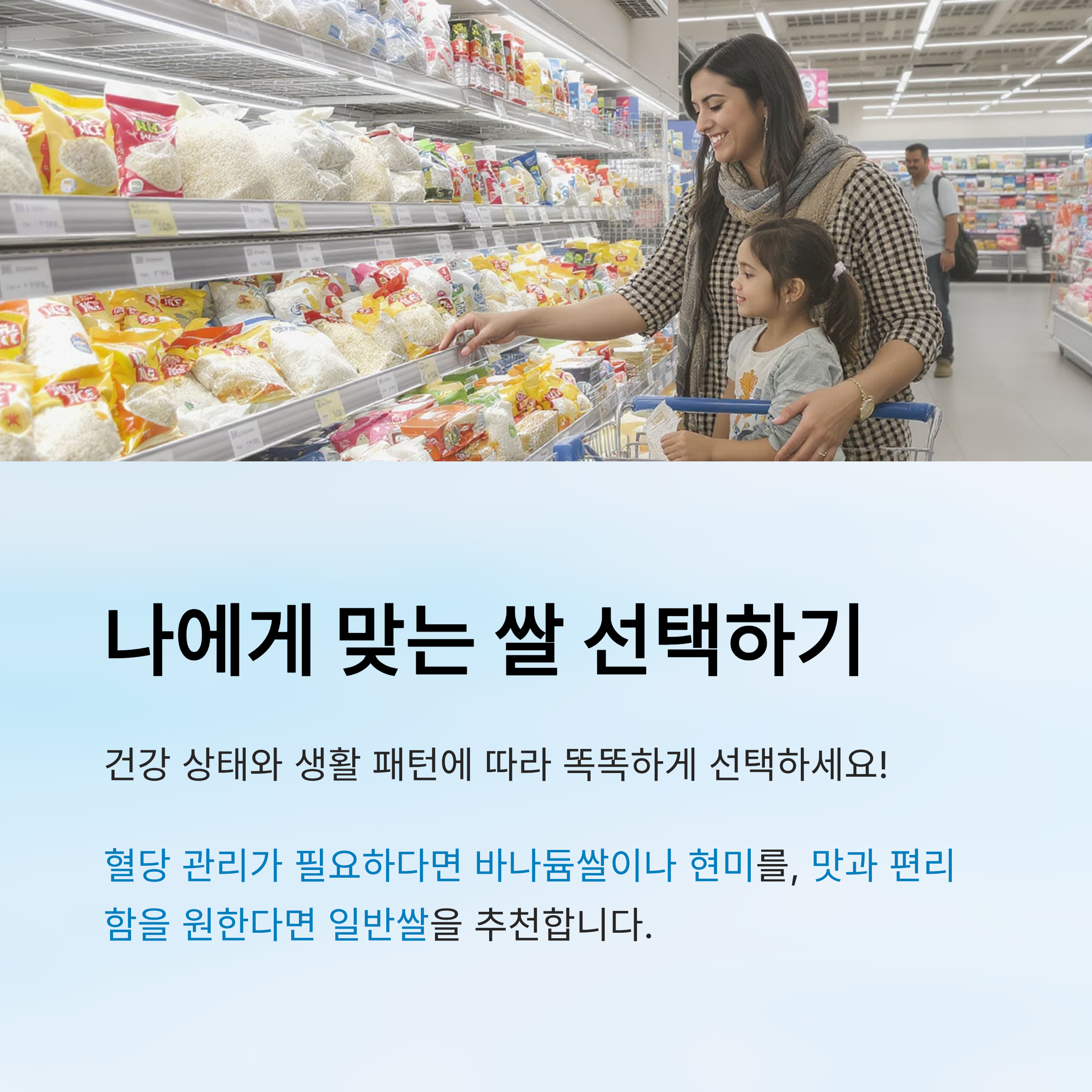 제가 생각했을 때, 미래에는 가정마다 목적에 맞는 쌀을 함께 구비해 두는 경우가 많아질 것 같아요. 예를 들어 평소에는 백미나 바나듐쌀을 먹고, 건강 관리가 필요할 때는 현미나 잡곡을 곁들이는 식이요. 결국 ‘나에게 맞는 쌀을 선택하는 유연성’이 중요한 시대가 될 거예요.