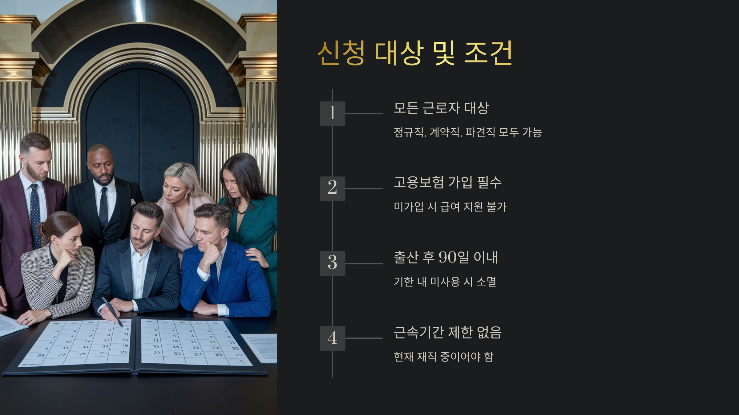 배우자 출산휴가를 신청할 때는 근속 기간이 제한되지 않지만, 현재 재직 중이어야 해요. 그리고 반드시 고용보험에 가입되어 있어야만 정부 지원금을 받을 수 있답니다. 😊