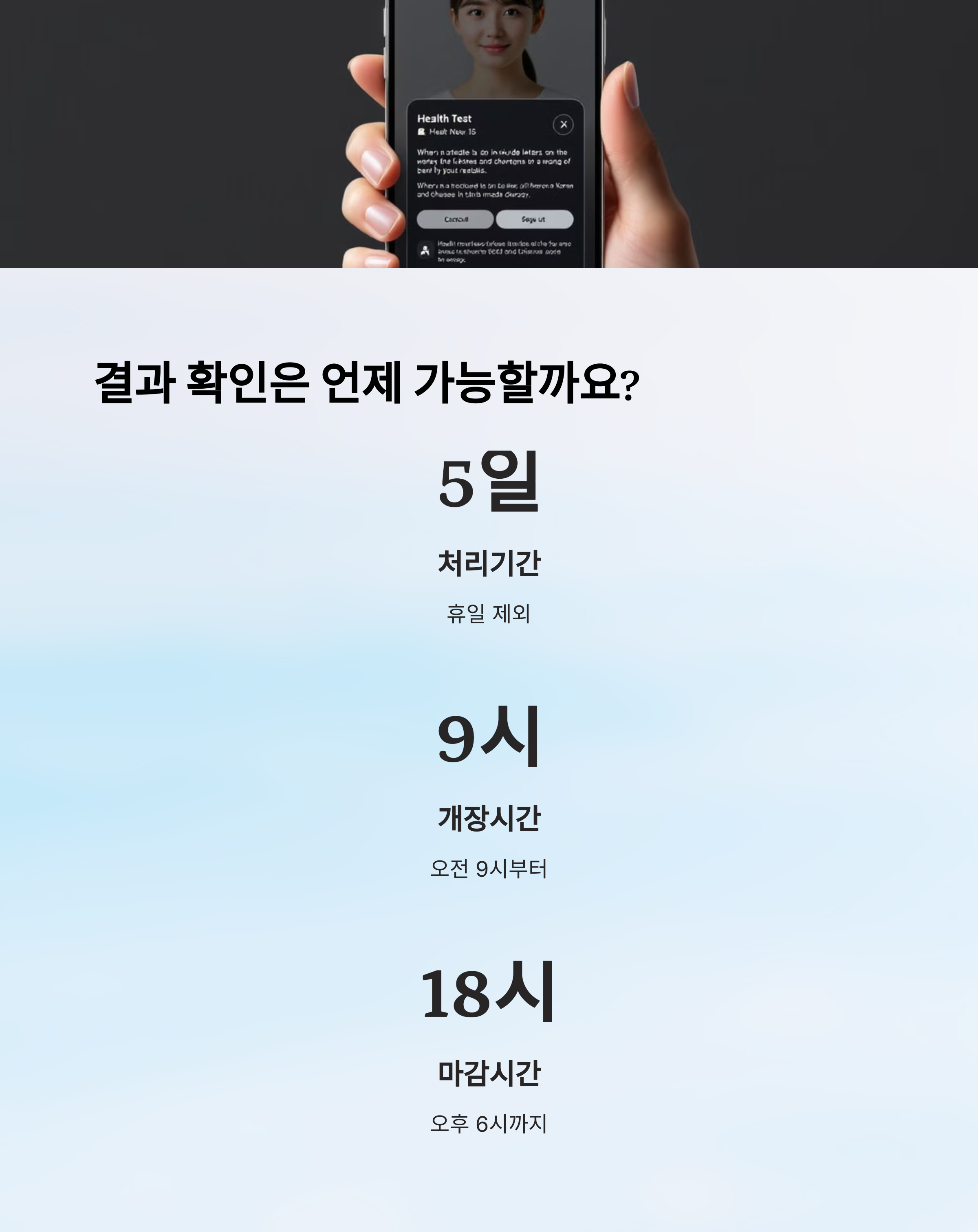 기본검사 외 추가 검사가 필요한 경우(예: 간염 백신 여부 미확인 시 혈액검사 추가) 시간이 더 소요돼요. 검사 항목이 많아지면 결과가 늦게 나오겠죠?