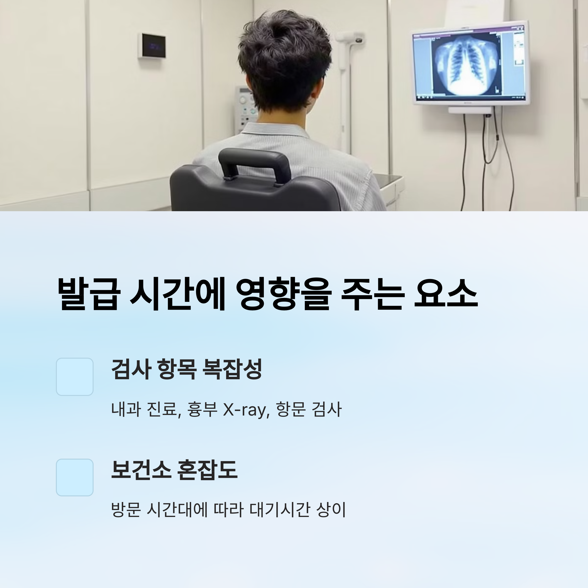 결핵, 장티푸스, B형간염 항체 검사 등 기본 검진 항목이 포함되는데, 검진 항목에 따라 결과가 나오는 속도도 달라져요. 어떤 항목은 당일 또는 익일 나올 수 있지만, 혈액 검사나 엑스레이 판독이 포함되면 시간이 좀 더 걸려요.