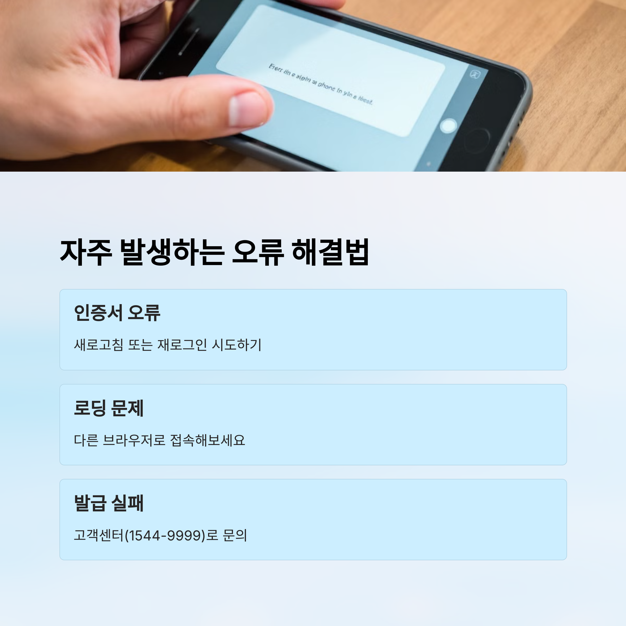 2️⃣ 인증서 오류: 공동인증서가 만료되었거나 저장 경로가 잘못된 경우가 많아요. 모바일 간편인증(PASS, 카카오)로 대체 인증하면 더 빠르고 안전해요.