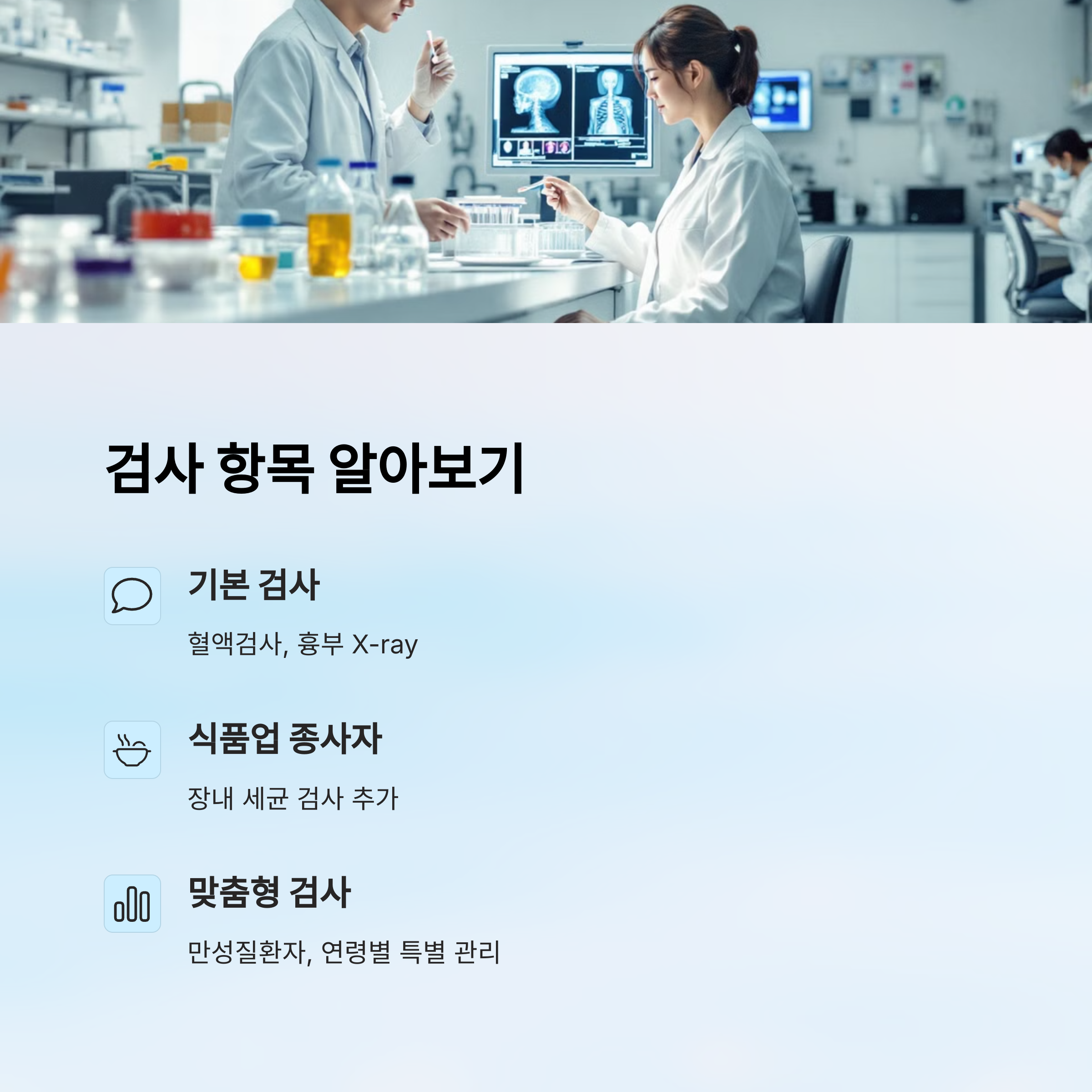 검사 항목은 직종에 따라 다르기 때문에, 갱신 시에도 자신이 하는 일에 맞는 항목을 정확히 다시 검사받아야 해요. 예를 들어, 식품을 다루는 직종은 장티푸스, B형간염 검사 등 필수 항목이 포함돼요. 검사를 받기 전 접수창구에서 직종을 설명하면 알아서 맞춤 항목으로 안내해줘요.