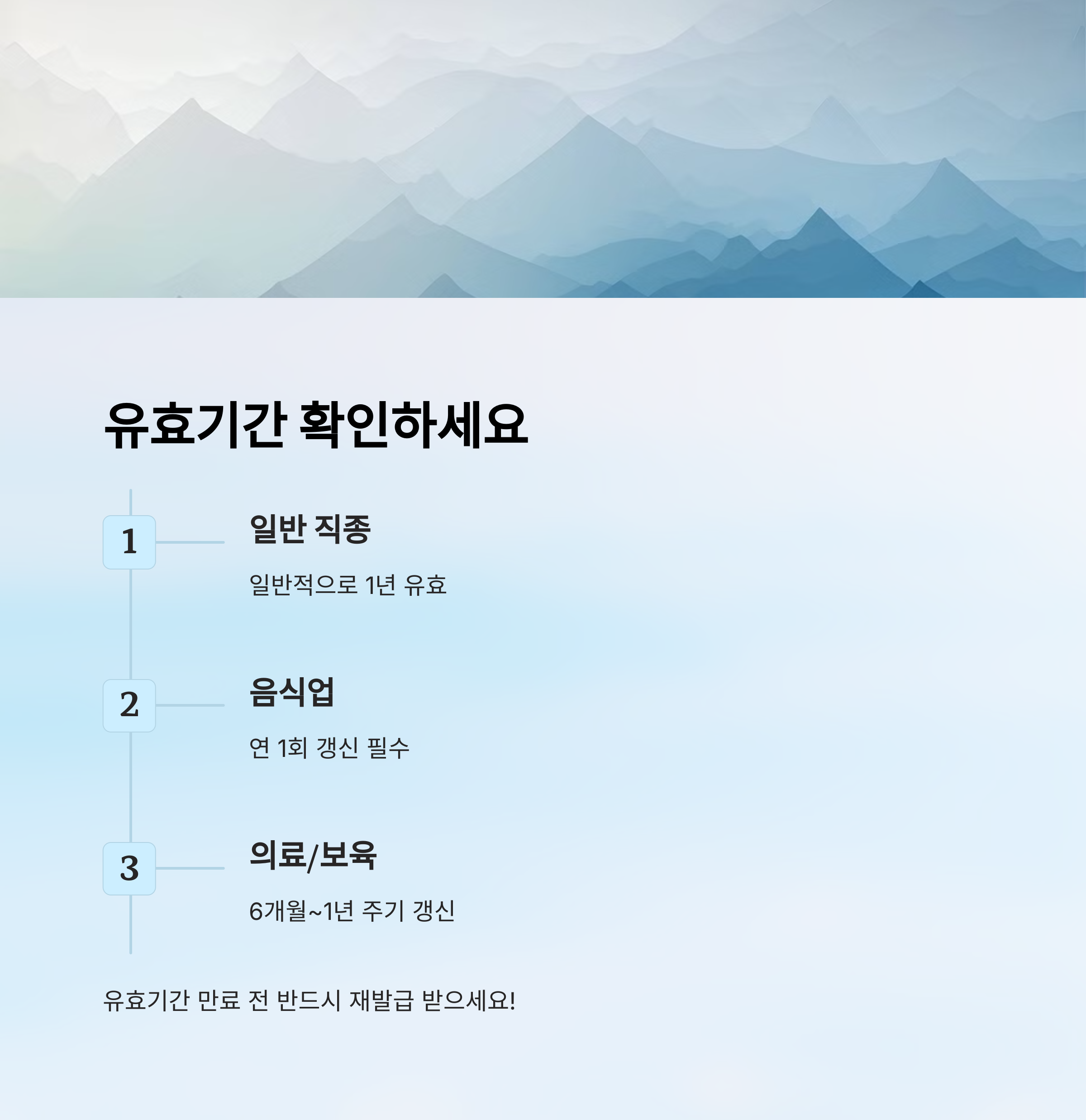 정리하자면 보건증은 ‘1년 단위 갱신’이 기본이에요. 다만 직종에 따라 예외가 있기 때문에 본인의 상황을 꼭 확인해야 해요! ⏳