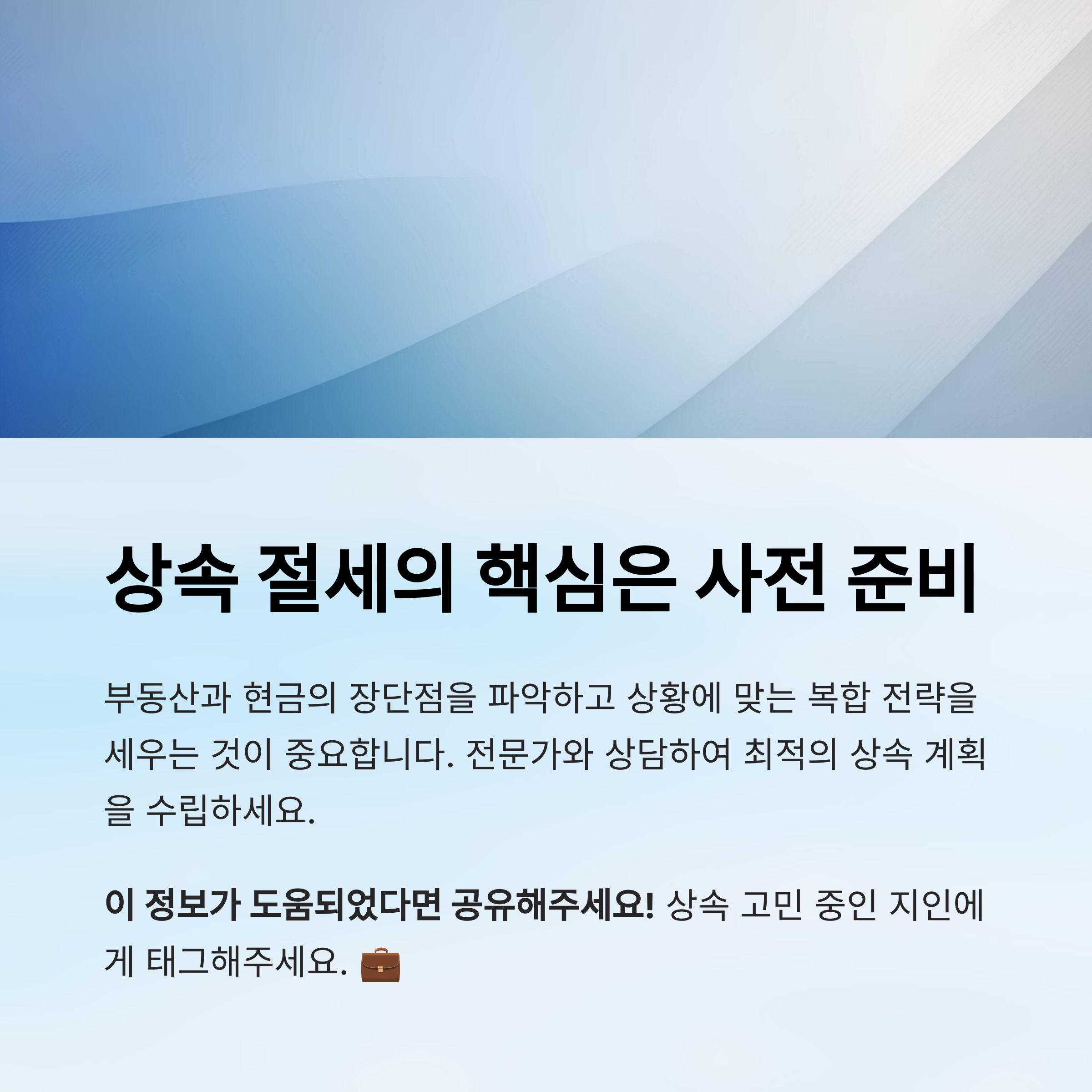 따라서 이상적인 전략은 부동산과 현금을 적절히 나누는 복합 상속이에요. 예를 들어 부동산으로 절세를 도모하면서, 일부 현금으로 상속세를 커버한다면 자산 보존과 세금 부담 두 마리 토끼를 잡을 수 있어요.