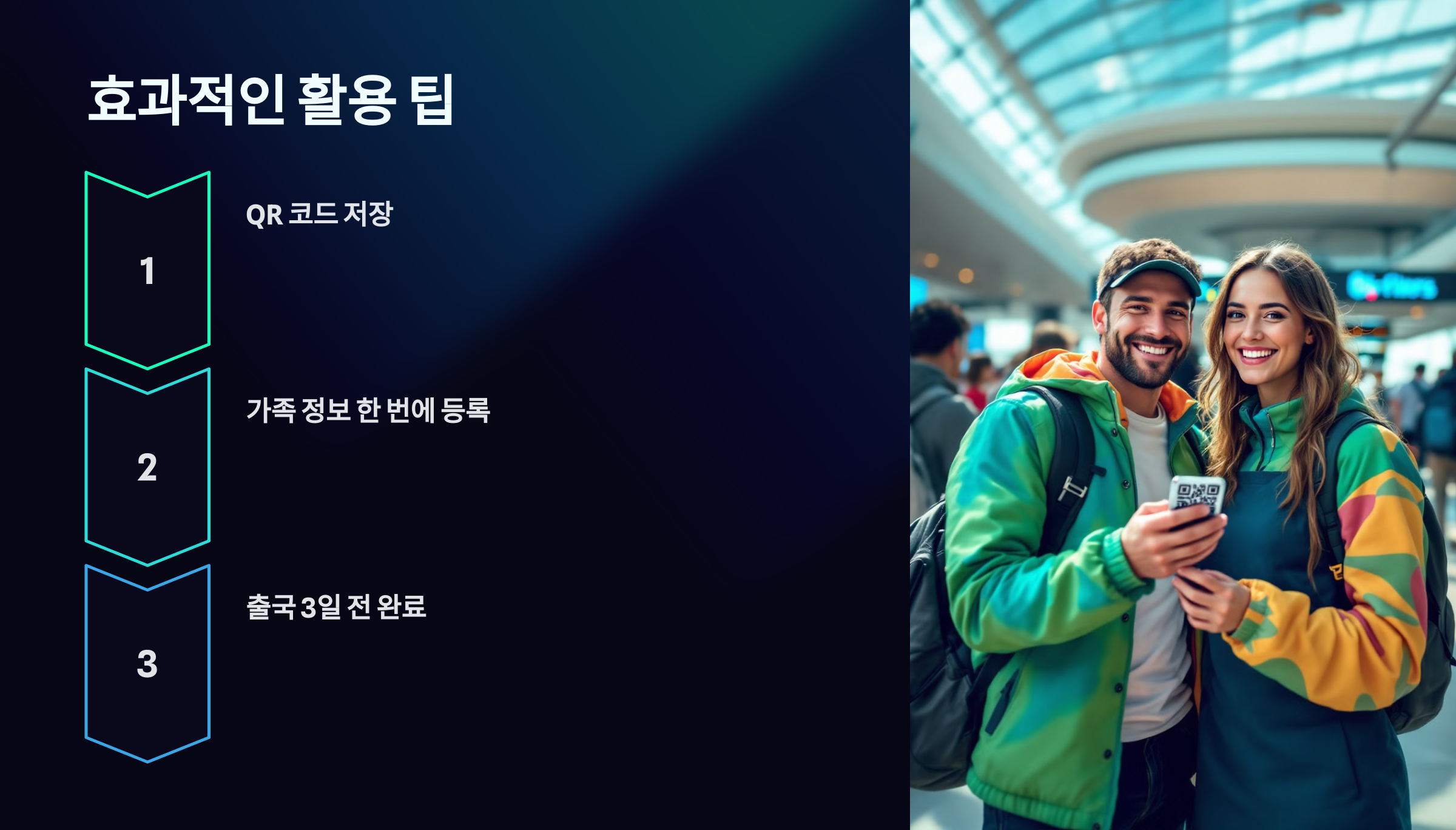 1. QR 코드를 스마트폰에 저장하거나 출력해 두세요. 공항에서 빠르게 사용할 수 있습니다.