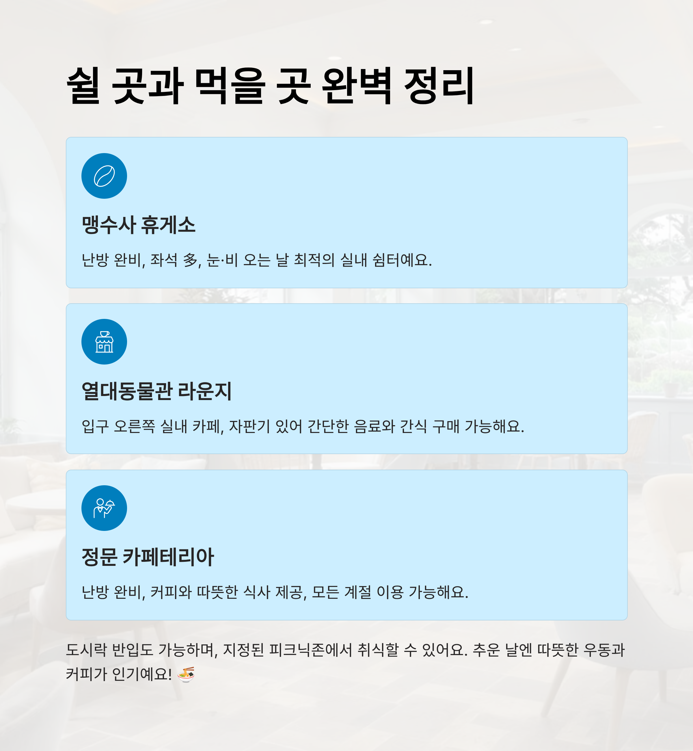 비가 오거나 눈이 내리는 날, 가장 필요한 건 바로 따뜻하게 쉴 수 있는 실내 공간이에요. 서울대공원 동물원에는 관람 중간에 쉬어갈 수 있는 실내 휴게 공간이 여러 군데 마련돼 있어서 날씨에 상관없이 편안한 쉼을 즐길 수 있답니다. 이 휴게소들은 모두 난방이 잘 되어 있어요. ☕