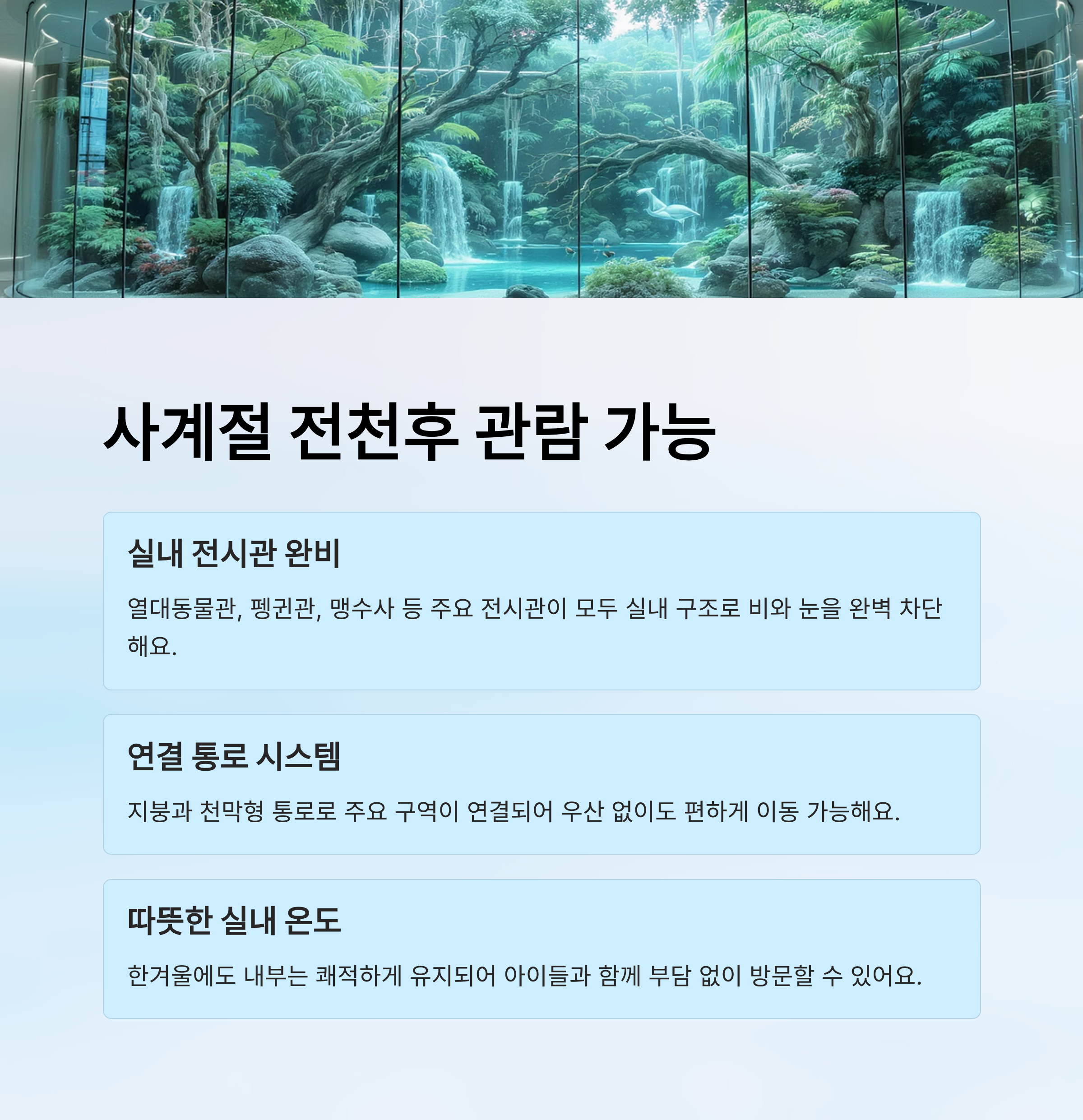 | 전시관 이름 | 주요 동물 | 특징 | 비/눈 날씨 적합도 |