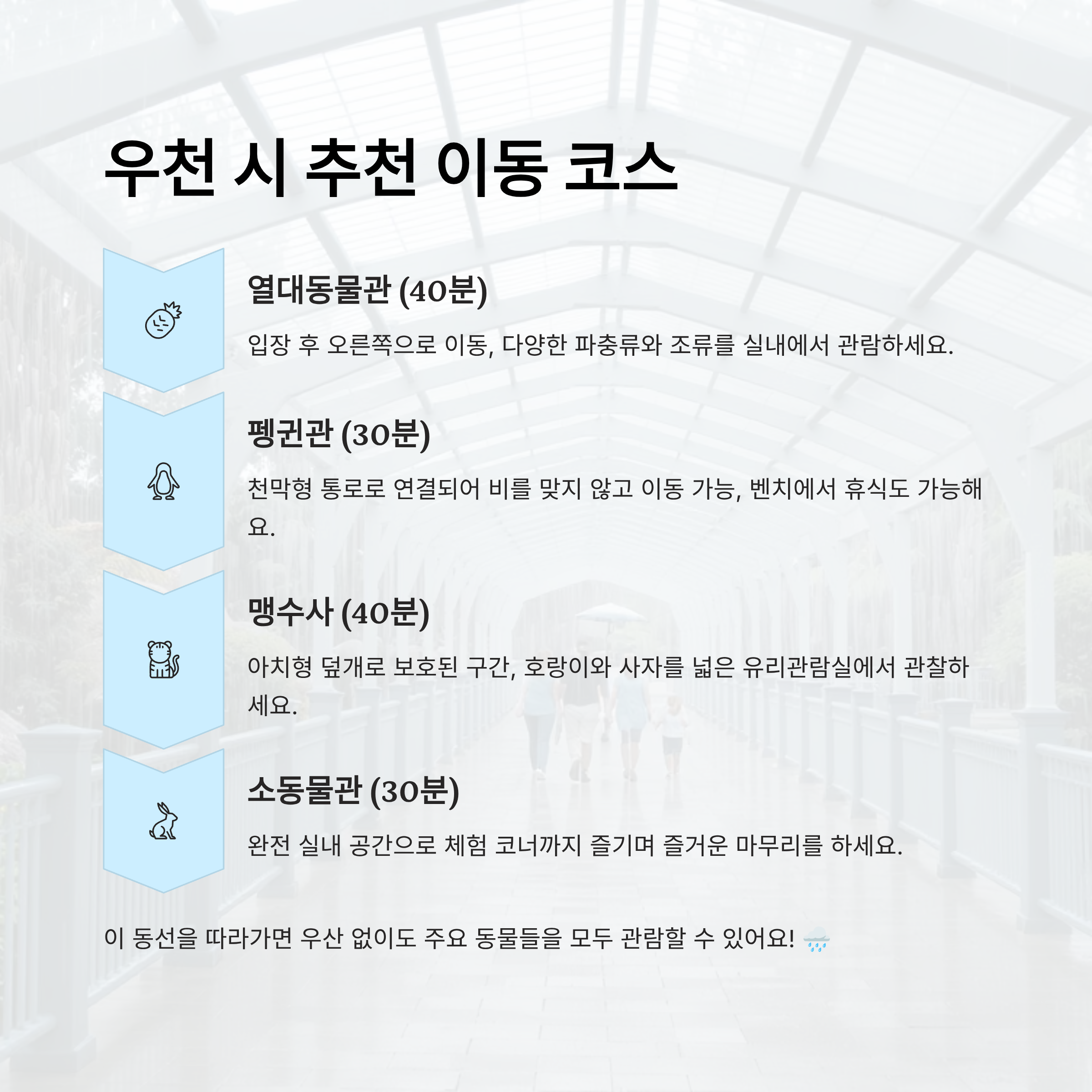 이 코스를 따라가면 하루 동안 날씨 걱정 없이 알차게 동물원을 둘러볼 수 있어요. 동선 자체가 자연스럽고 실내 중심이라 어린이와 노약자도 편하게 이동할 수 있답니다. 서울대공원의 ‘우천 시 코스’는 정말 잘 짜여진 시스템이에요. 🌧️🦓