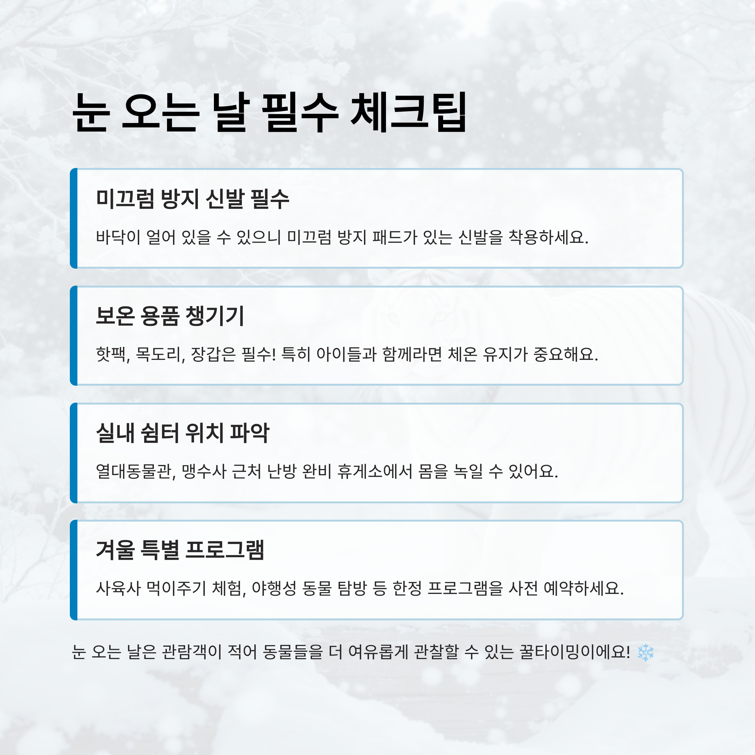 눈이 많이 오는 날은 관람객이 줄어들기 때문에 동물들을 더 가까이에서 여유롭게 볼 수 있다는 장점도 있어요. 겨울철 특유의 고요한 분위기 속에서 동물들과 눈을 마주치는 경험은 아이에게도 어른에게도 오랫동안 기억에 남는 추억이 된답니다. ☃️