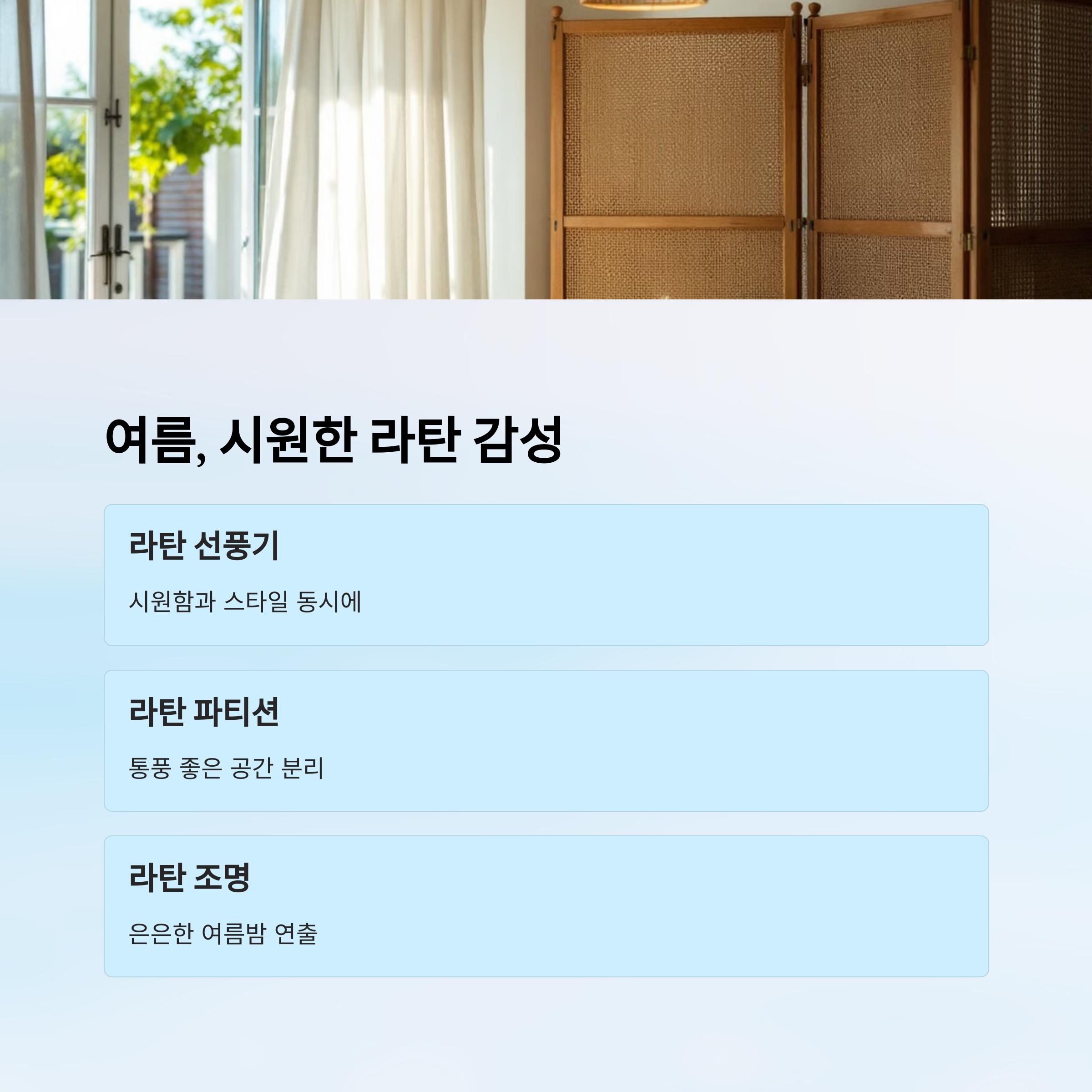 | 라탄 아이템 | 어울리는 소품 | 추천 장소 | 계절 |