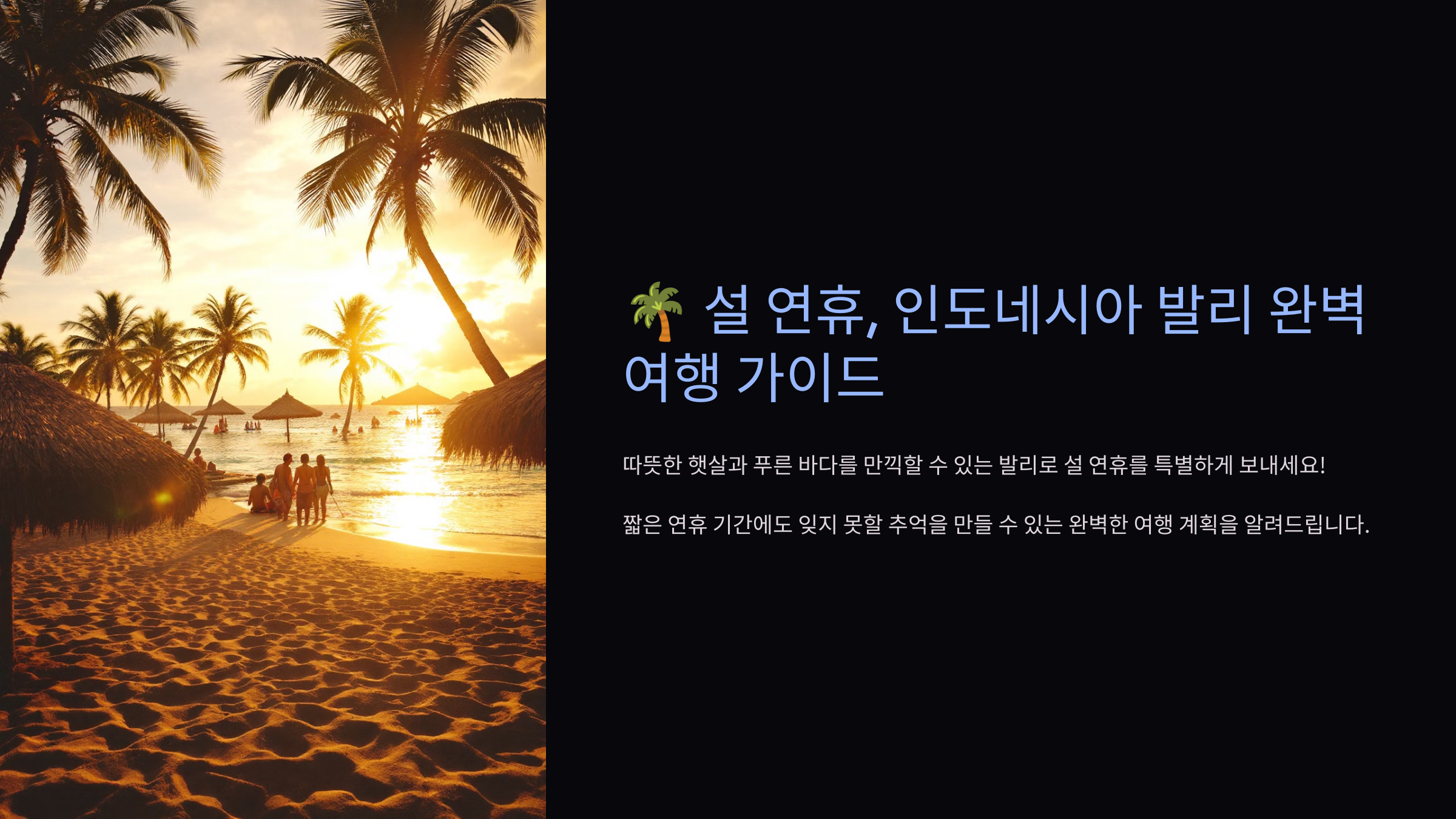 "따뜻한 햇살과 푸른 바다를 만끽할 수 있는 발리로 설 연휴를 특별하게 보내보세요! ✈️ 짧은 연휴 기간에도 잊지 못할 추억을 만들 수 있는 완벽한 여행 계획을 알려드립니다. 초보자도 쉽게 따라 할 수 있는 꿀팁 대방출!"