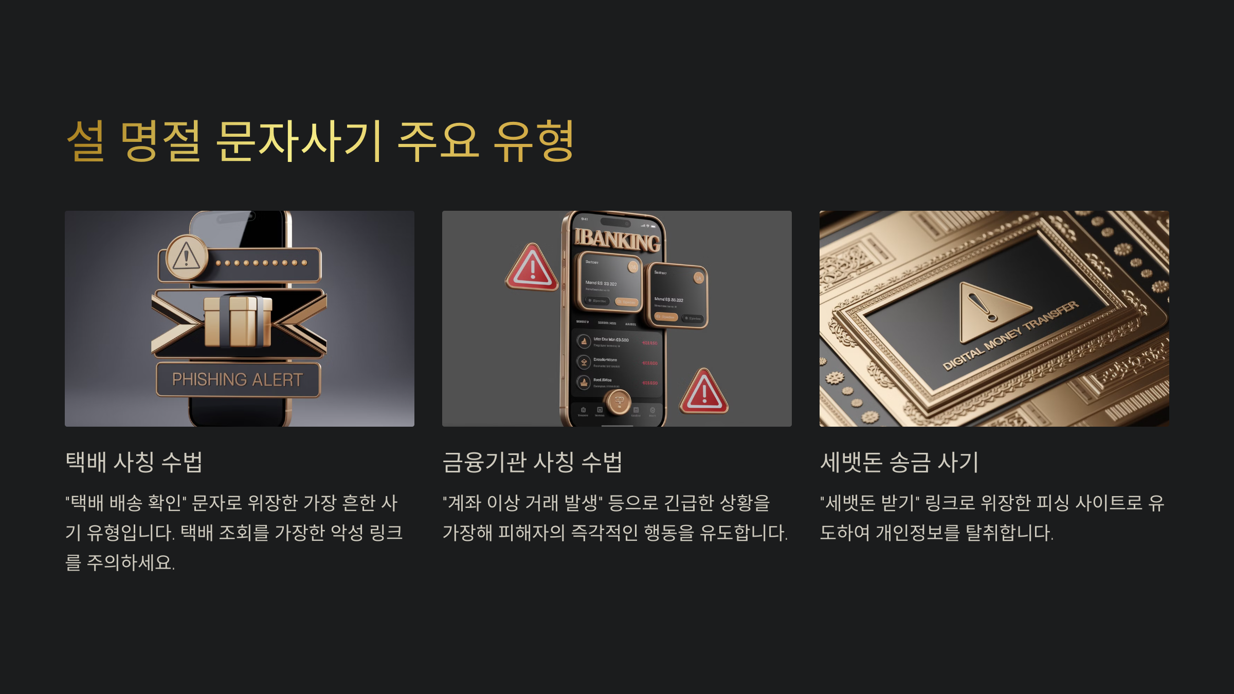 설 명절에 자주 등장하는 문자사기는 우리의 심리를 교묘히 이용하는 특징이 있어요. 명절 특성상 사람들은 택배나 송금을 많이 이용하니까, 이와 관련된 내용으로 접근하는 경우가 대부분이에요. 주요 유형은 다음과 같아요:
