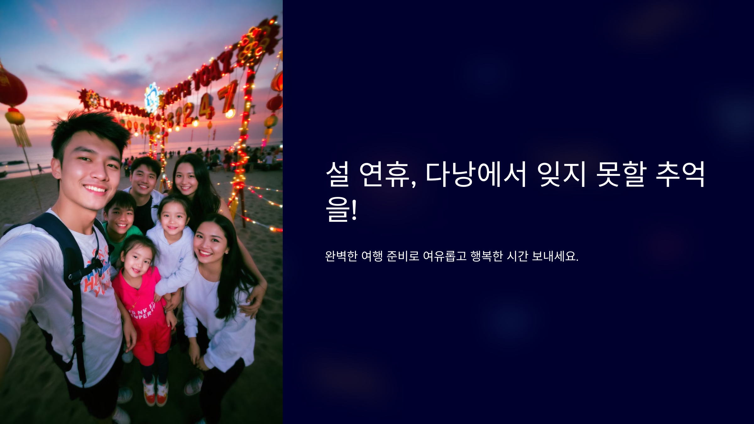 "이번 설 연휴는 따뜻한 다낭에서 잊지 못할 추억을 만들어 보세요! 완벽한 여행 준비로 여유롭고 행복한 시간을 보내시길 바랍니다. 😊"