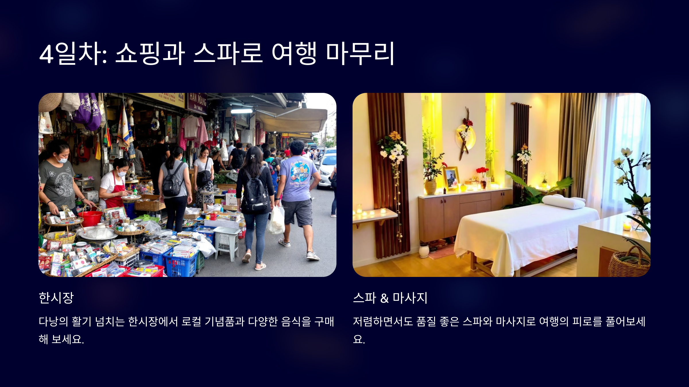다낭 전통 시장에서 로컬 기념품과 음식을 구매해보세요.- 추천 아이템: 커피, 드라이 과일, 베트남 전통 모자 논라