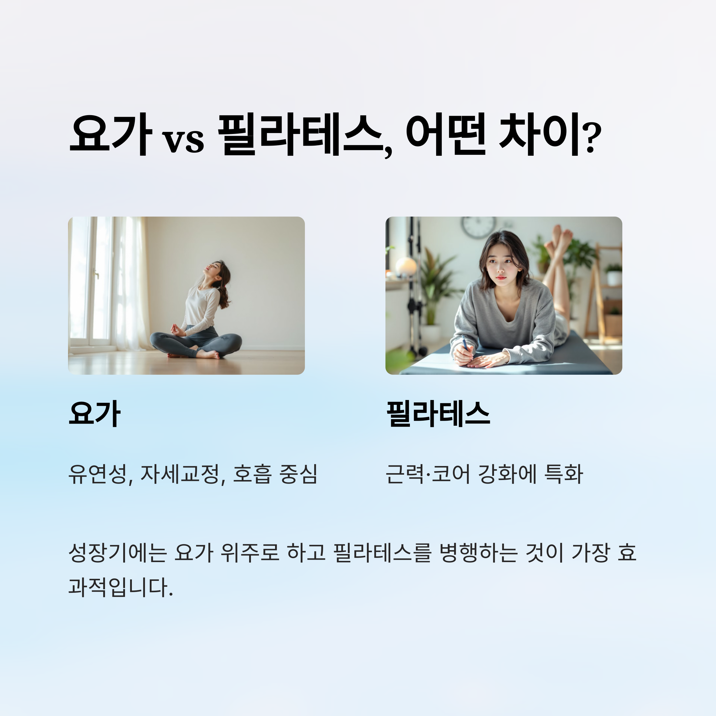 요가와 필라테스는 모두 유연성과 체형 교정에 도움을 주는 운동이에요. 특히 성장기 아이들이나 자세가 안 좋은 청소년에게 아주 좋아요. 그런데 둘 다 비슷해 보여도 핵심 목적과 사용하는 근육이 조금 다르기 때문에 자신에게 맞는 걸 선택하는 게 중요해요!