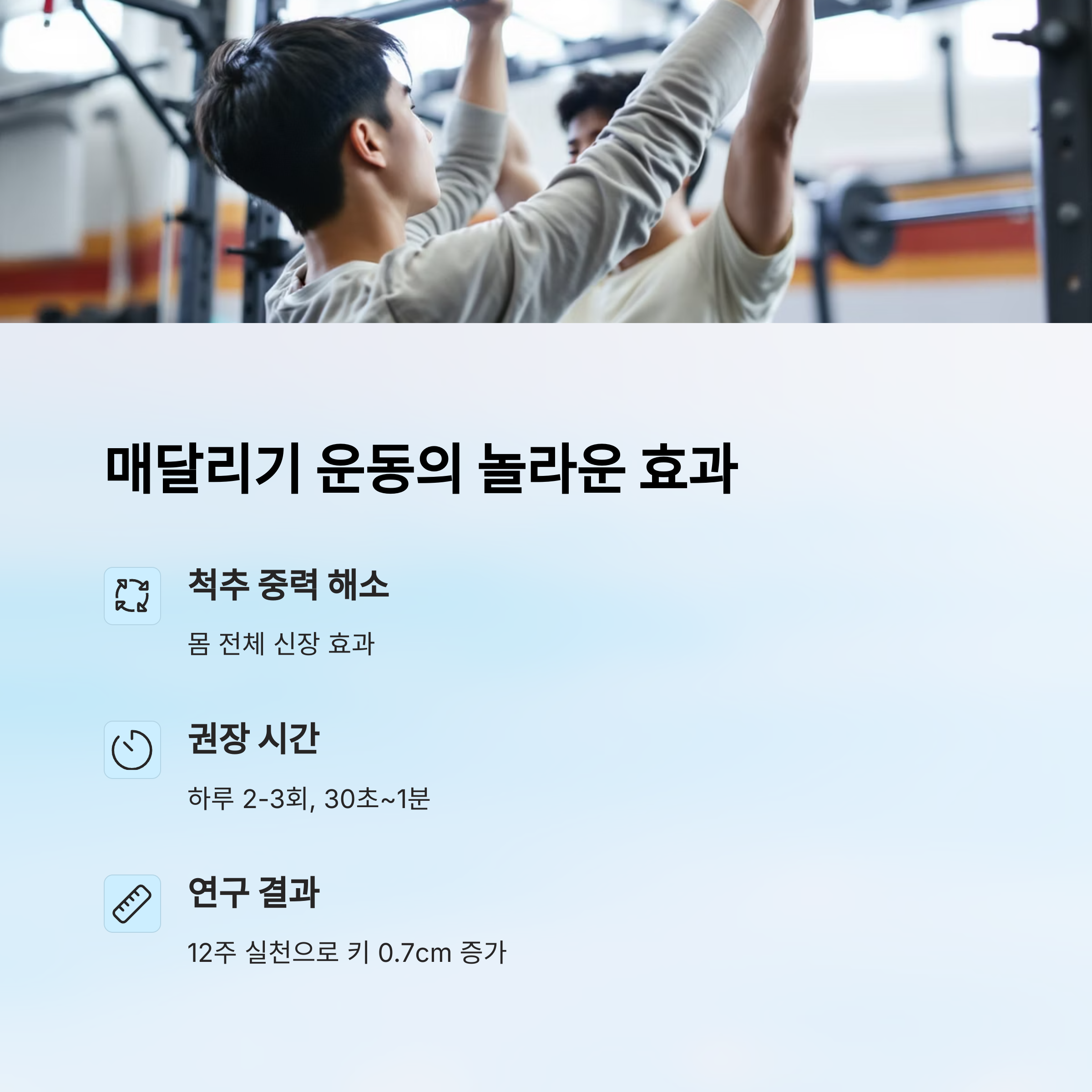 하루에 3세트, 한 세트당 30초~1분 정도 매달리기를 해보세요. 처음엔 손이 아플 수도 있지만, 점점 근력이 생기고 몸의 균형도 좋아져요. 키가 크는 것뿐 아니라 등과 어깨의 자세도 함께 교정돼요. 성장기 학생뿐 아니라 자세가 구부정한 성인들에게도 정말 좋은 운동이에요!