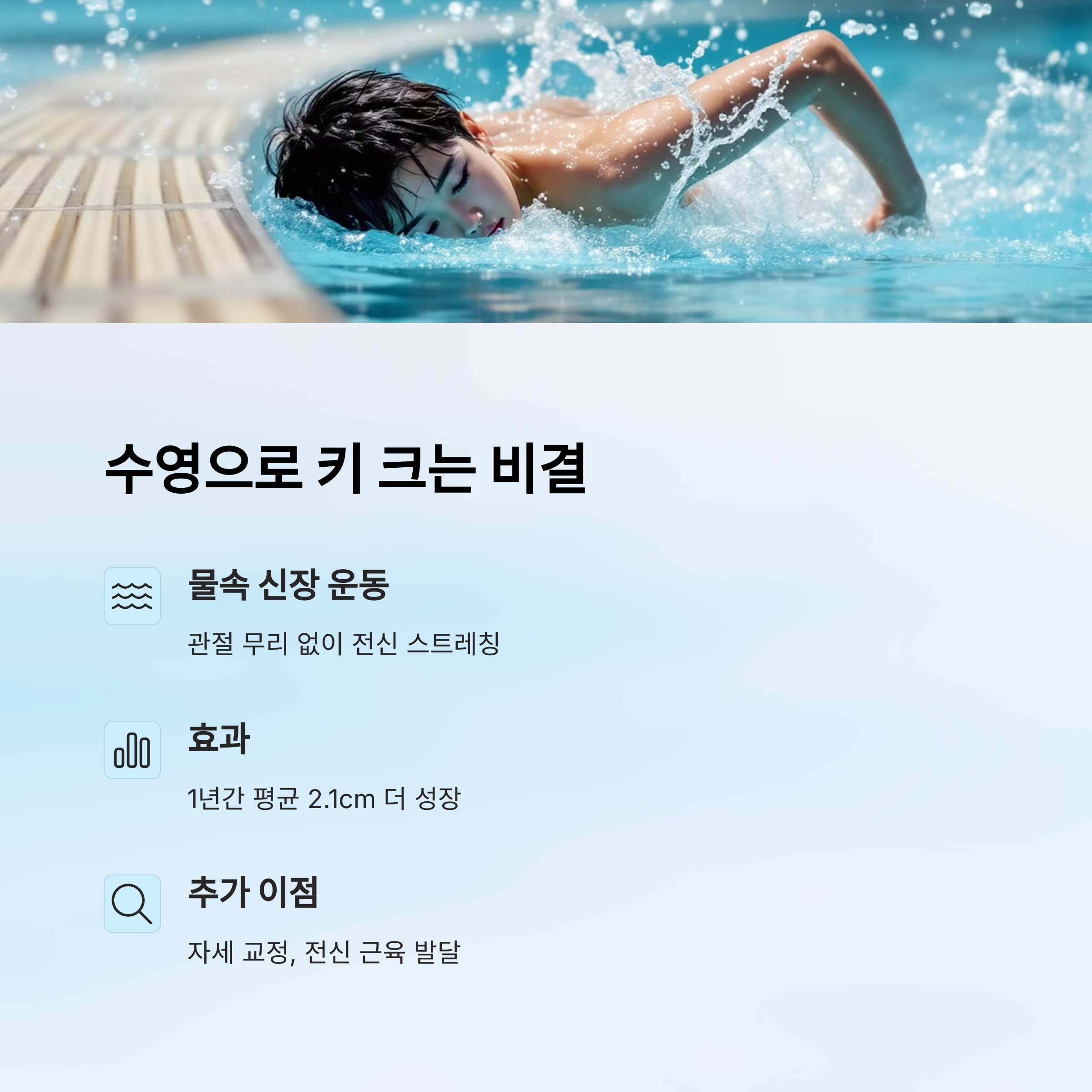 수영을 하면 척추가 자연스럽게 펴지고, 근육이 스트레칭되며 유연성이 길러져요. 이 과정에서 자세가 개선되고, 뼈와 관절 사이의 간격도 넓어질 수 있답니다. 실제로 성장기 청소년들 중에 수영을 꾸준히 하는 경우 평균 신장이 더 크다는 조사 결과도 있어요.