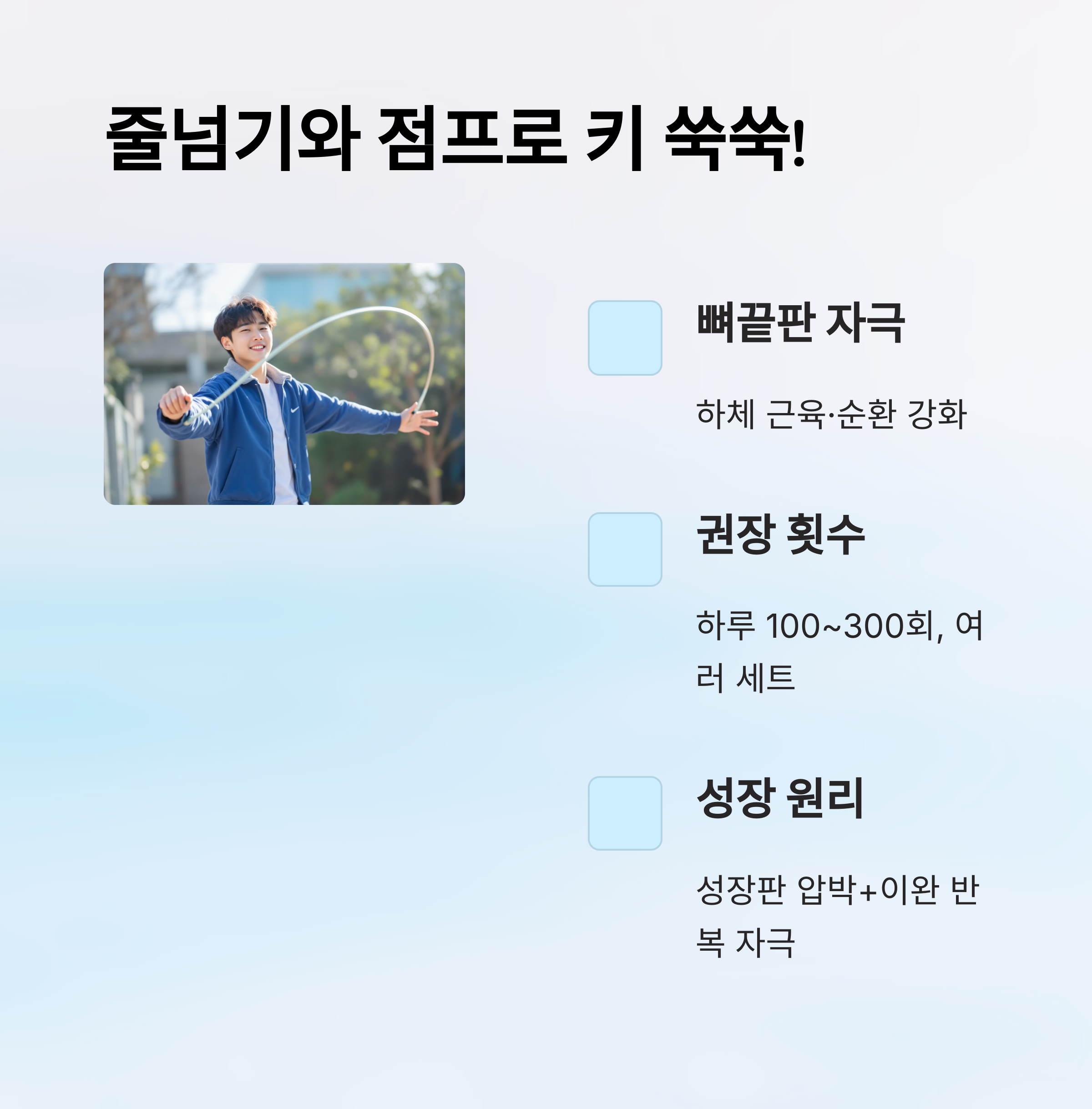 줄넘기와 점프 운동은 키 크기에 아주 좋은 자극을 주는 대표적인 운동이에요. 성장판은 무릎, 발목, 척추 등 여러 부위에 위치하는데요, 점프를 반복하면 그 부위들이 자연스럽게 자극되면서 성장판에 긍정적인 영향을 줘요. 특히 줄넘기는 심박수를 올려주고 성장호르몬 분비도 촉진시킨다는 점에서 효과적이에요!