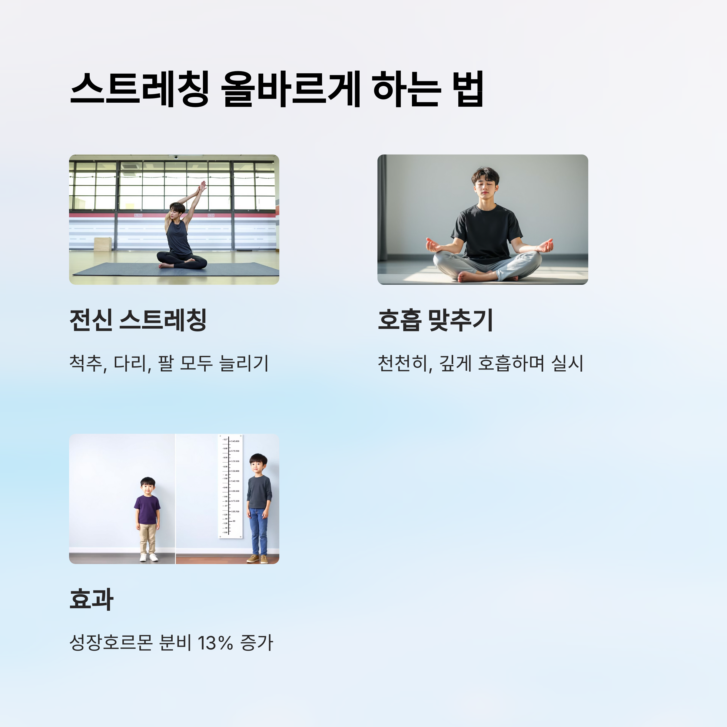 스트레칭은 단순한 몸 풀기 이상의 효과를 가지고 있어요. 특히 키 크기에 있어서 스트레칭은 척추의 압박을 줄이고 몸을 곧게 펴주는 데 큰 도움이 돼요. 아침, 저녁 하루 두 번 10분씩만 해도 몸이 훨씬 유연해지고, 혈액순환도 좋아져서 성장 환경이 최적화된답니다.