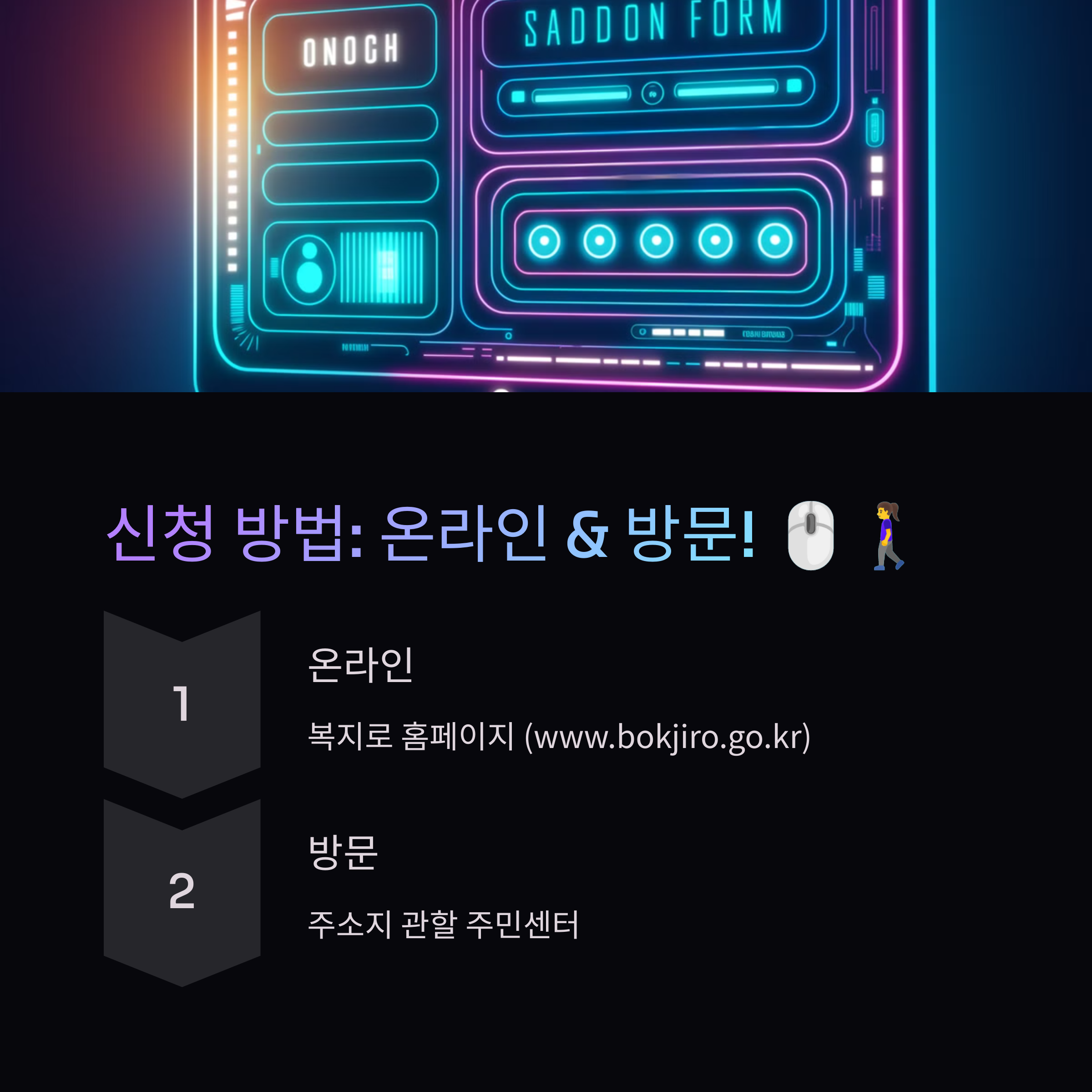 - 방문 신청: 가까운 주민센터(행정복지센터) 방문 후 신청서 작성 및 서류 제출