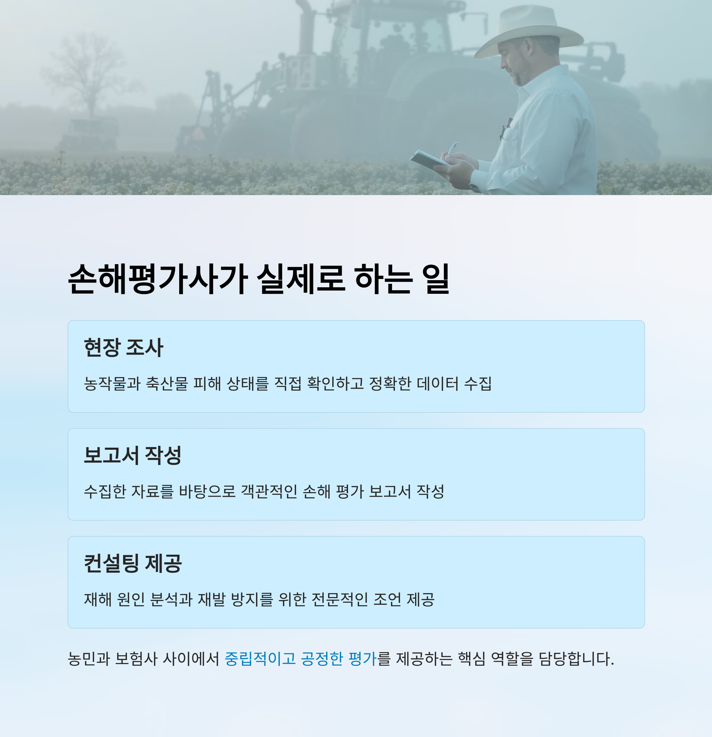 여기까지 보면 손해평가사의 일은 생각보다 전문성과 책임감을 많이 요구한다는 걸 알 수 있어요. 이제 이어지는 장에서는 실제 현직자가 하루를 어떻게 보내는지, 생생한 일과를 살펴볼 거예요.