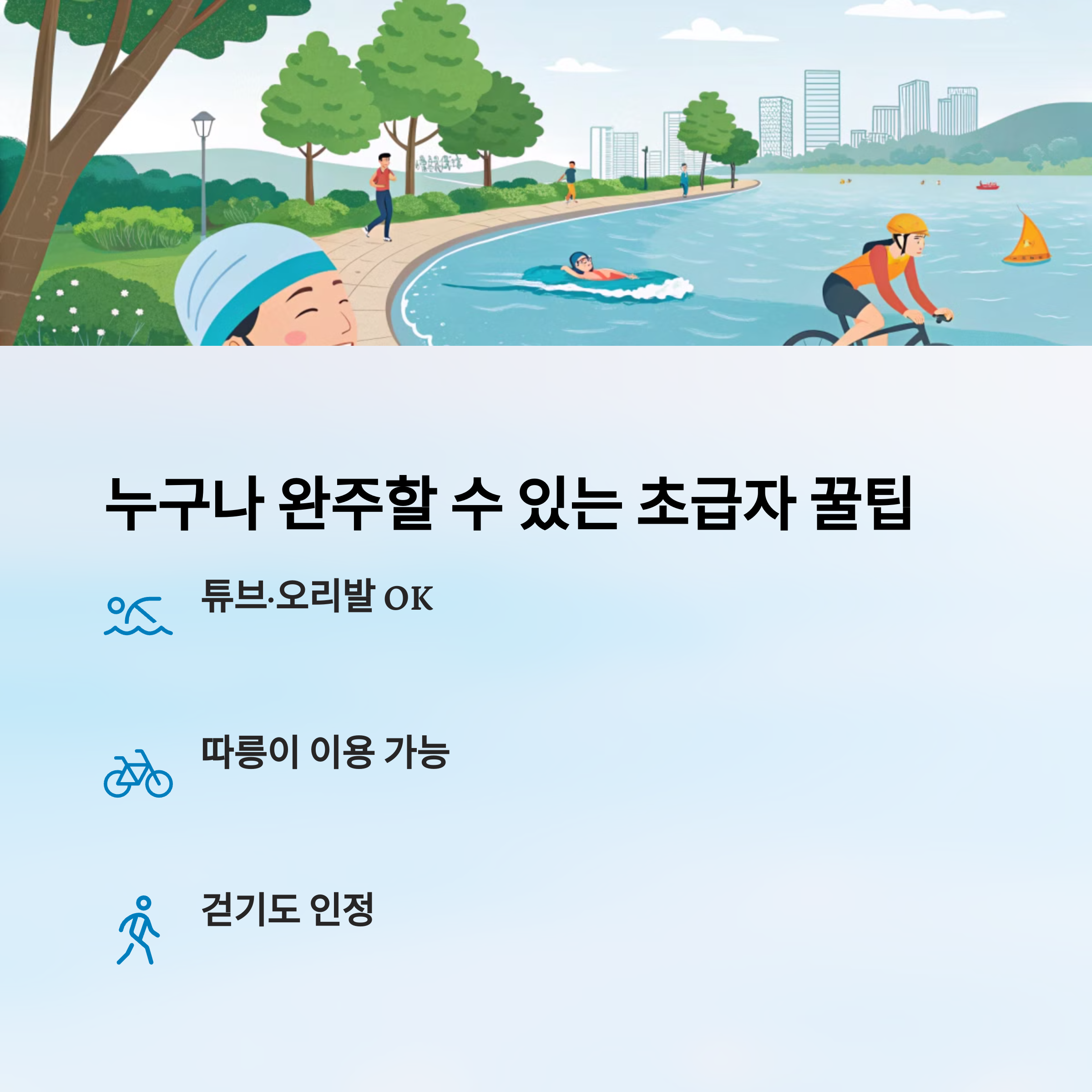 축제에서는 수영, 자전거, 달리기를 한꺼번에 즐길 수 있어요. 하지만, 기록보다는 참가자의 건강과 재미를 최우선으로 두고 있어요. 초보자도 부담 없이 완주할 수 있도록 난이도별 맞춤 코스가 준비되어 있답니다. 🏅