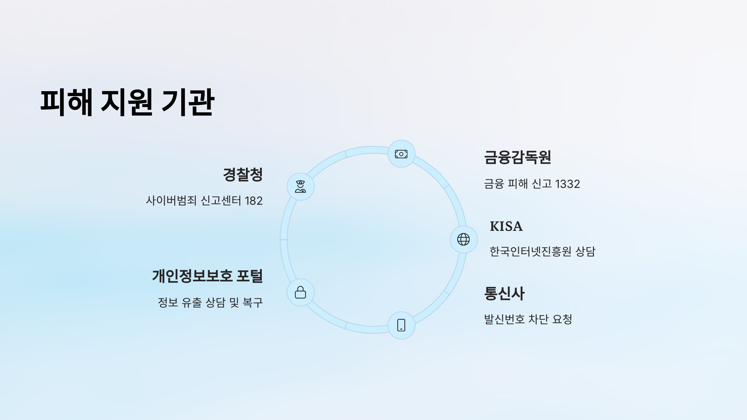 2. 금융감독원(1332): 금융 피해가 발생한 경우 금감원에 신고해 피해 복구 절차를 문의하세요. 해당 금융기관과도 협력해 대처해야 해요.