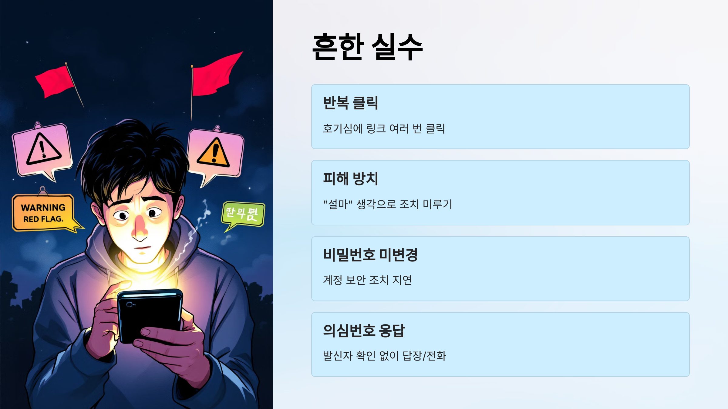 스미싱 피해를 입은 후 대처 과정에서 발생할 수 있는 실수들은 추가적인 피해로 이어질 수 있어요. 아래에서 흔히 하는 실수와 이를 방지하기 위한 방법을 알아볼게요.