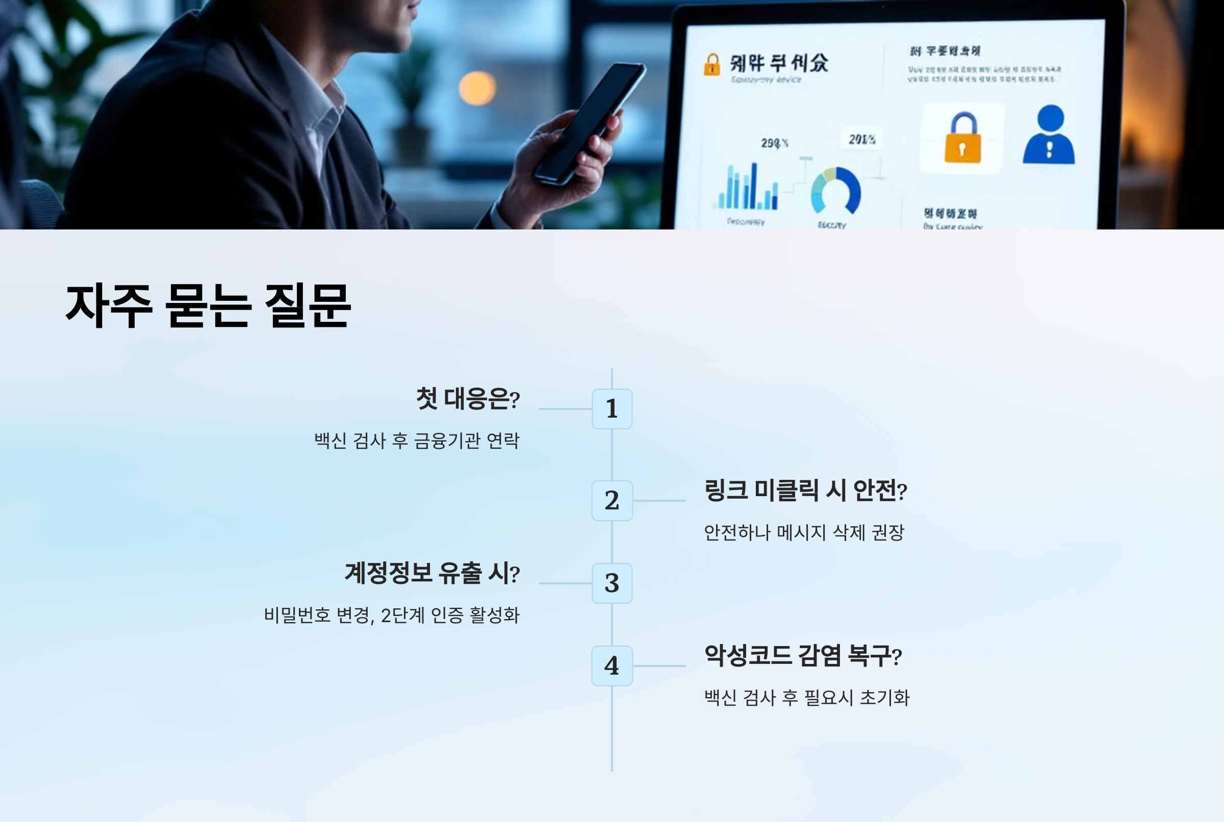 A1. 스미싱 피해를 당했다면 즉시 악성코드 감염 여부를 확인하기 위해 스마트폰 백신 앱으로 검사를 진행하세요. 동시에 해당 금융기관에 연락해 계정을 정지하고, 추가 피해를 방지하기 위한 조치를 요청해야 해요.