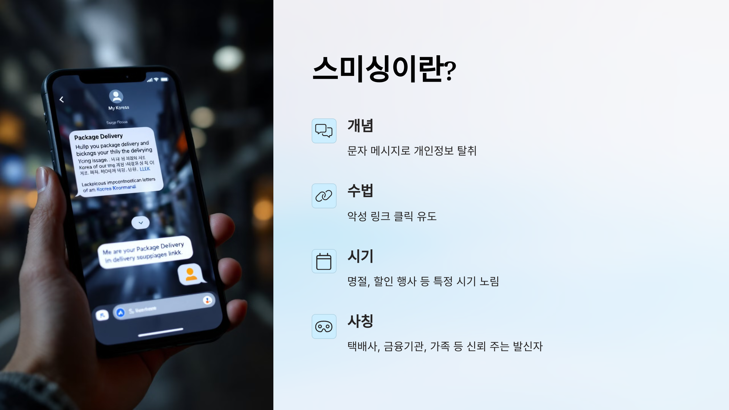 스미싱(Smishing)은 문자 메시지를 이용한 피싱(Phishing) 기법으로, 피해자가 문자에 포함된 악성 링크를 클릭하거나 정보를 입력하도록 유도하여 금융 정보, 개인정보를 탈취하는 사기 방식이에요. 최근 설 명절, 연말연시와 같은 특정 시기에는 스미싱 피해가 더욱 빈번히 발생하고 있어요.
