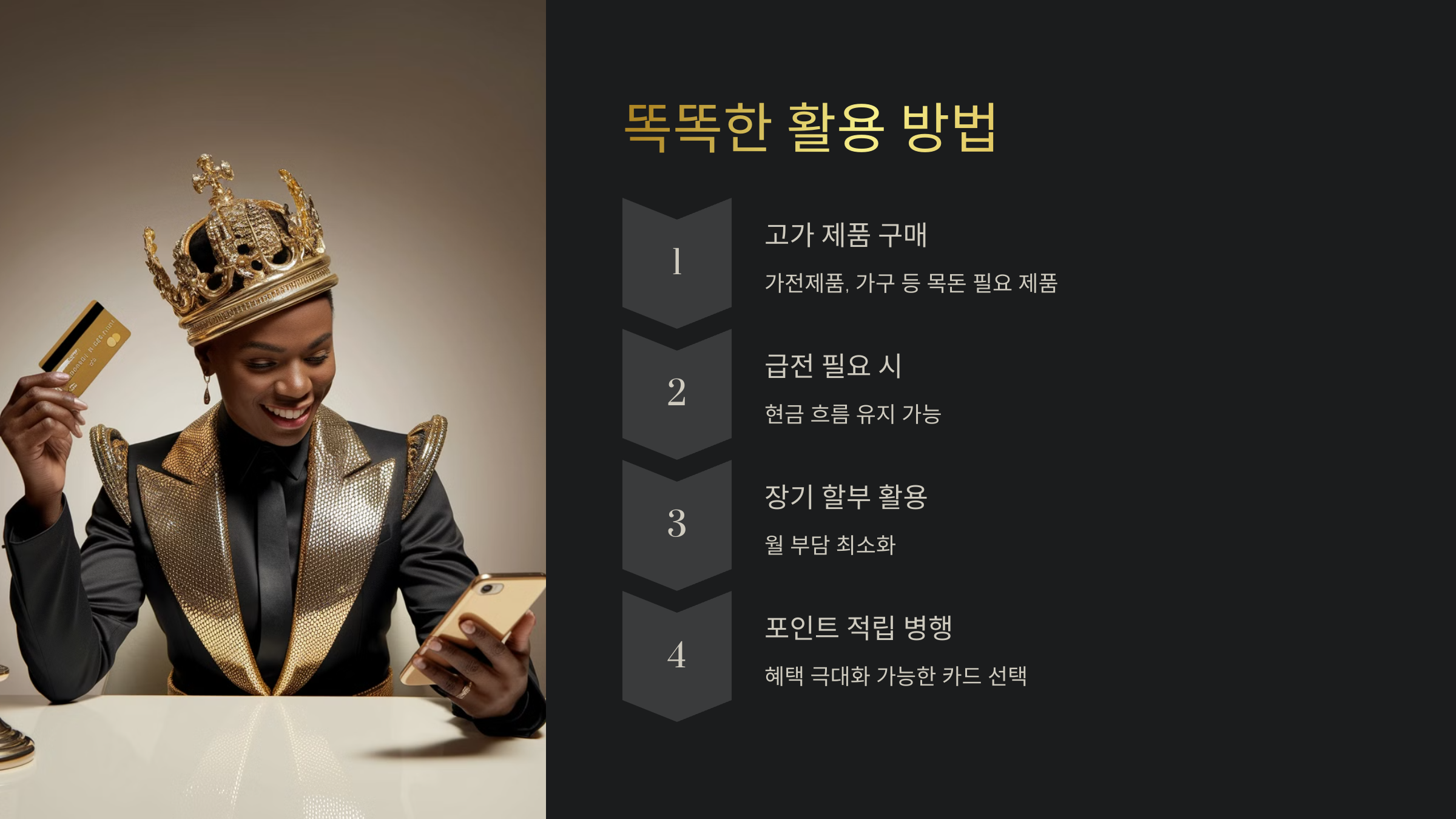 ✔ **고금리 예·적금과 함께 사용하기** - 할부로 결제하고, 남은 돈을 **단기 고금리 예금**에 넣으면 이자 수익을 얻을 수 있어요.