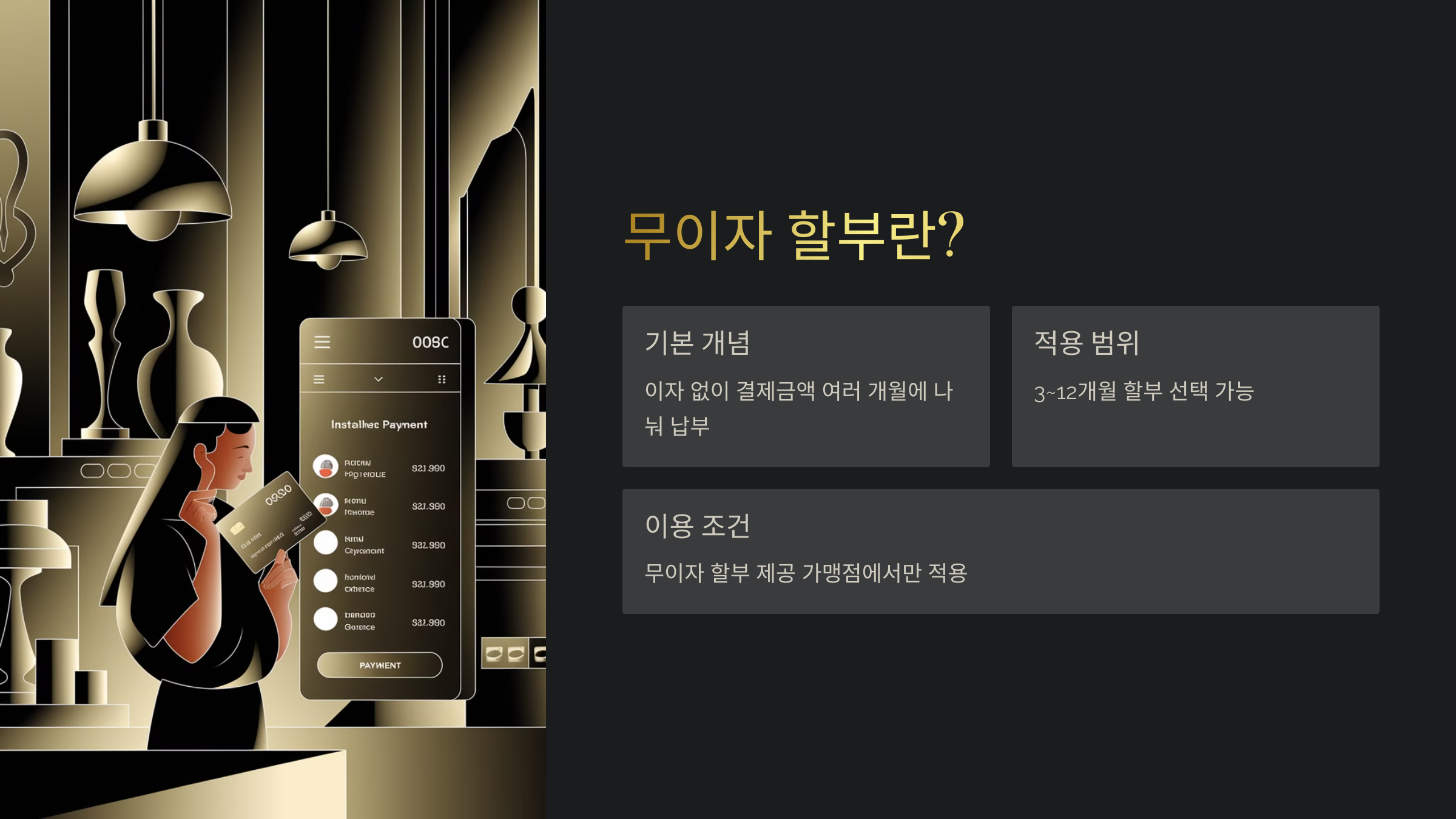 ✔ **3개월~12개월 할부 선택 가능 (카드사별 상이)** ✔ **할부 이자는 카드사가 부담 → 소비자는 추가 부담 없음** ✔ **무이자 할부를 제공하는 가맹점에서만 적용 가능**