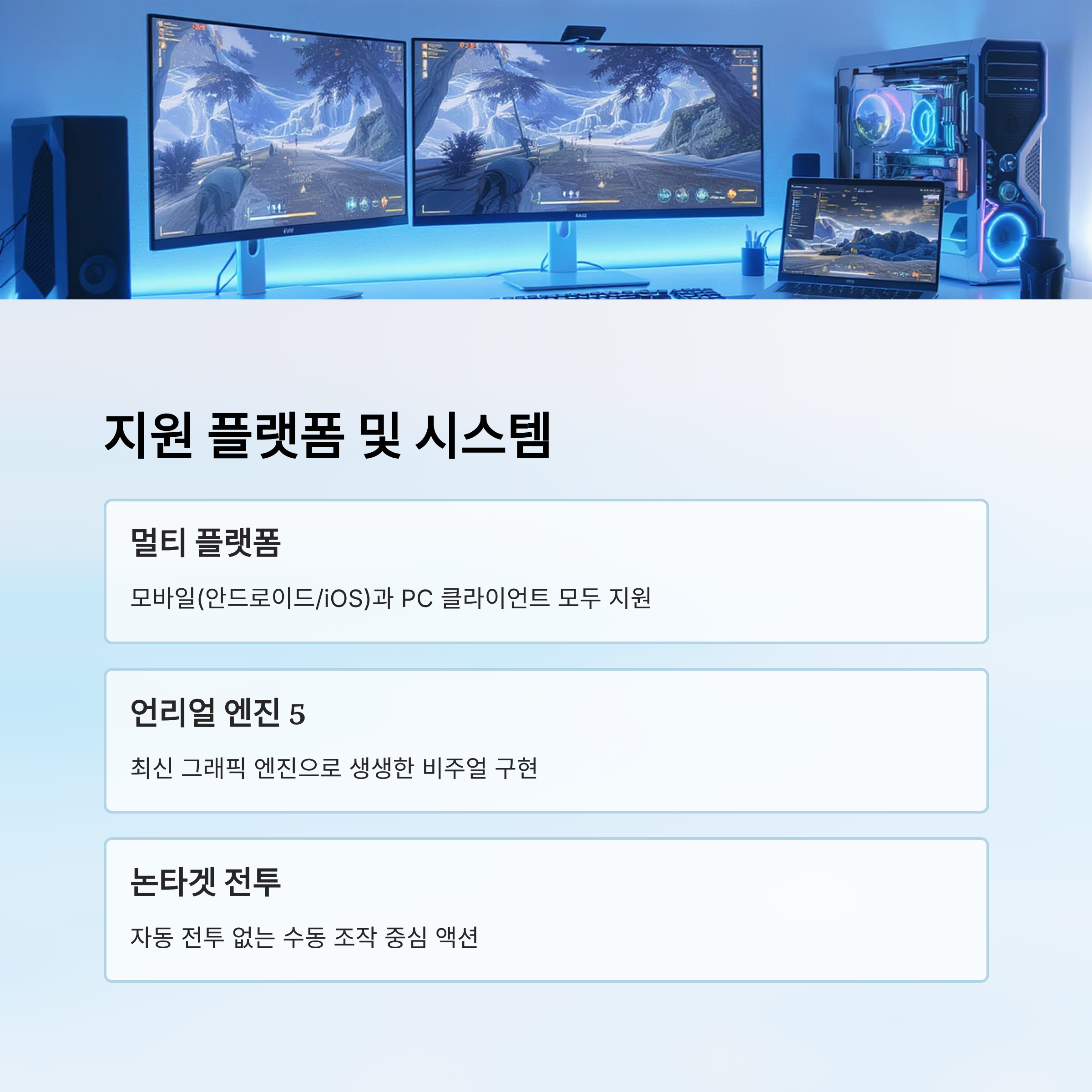전투는 액션성과 전략성을 모두 갖추고 있어 PvE 중심이지만, 파티 구성과 길드 협력 요소도 잘 살아있어요. 다양한 기기에서 매끄럽게 연동되는 것이 진정한 강점이에요! 💻📱
