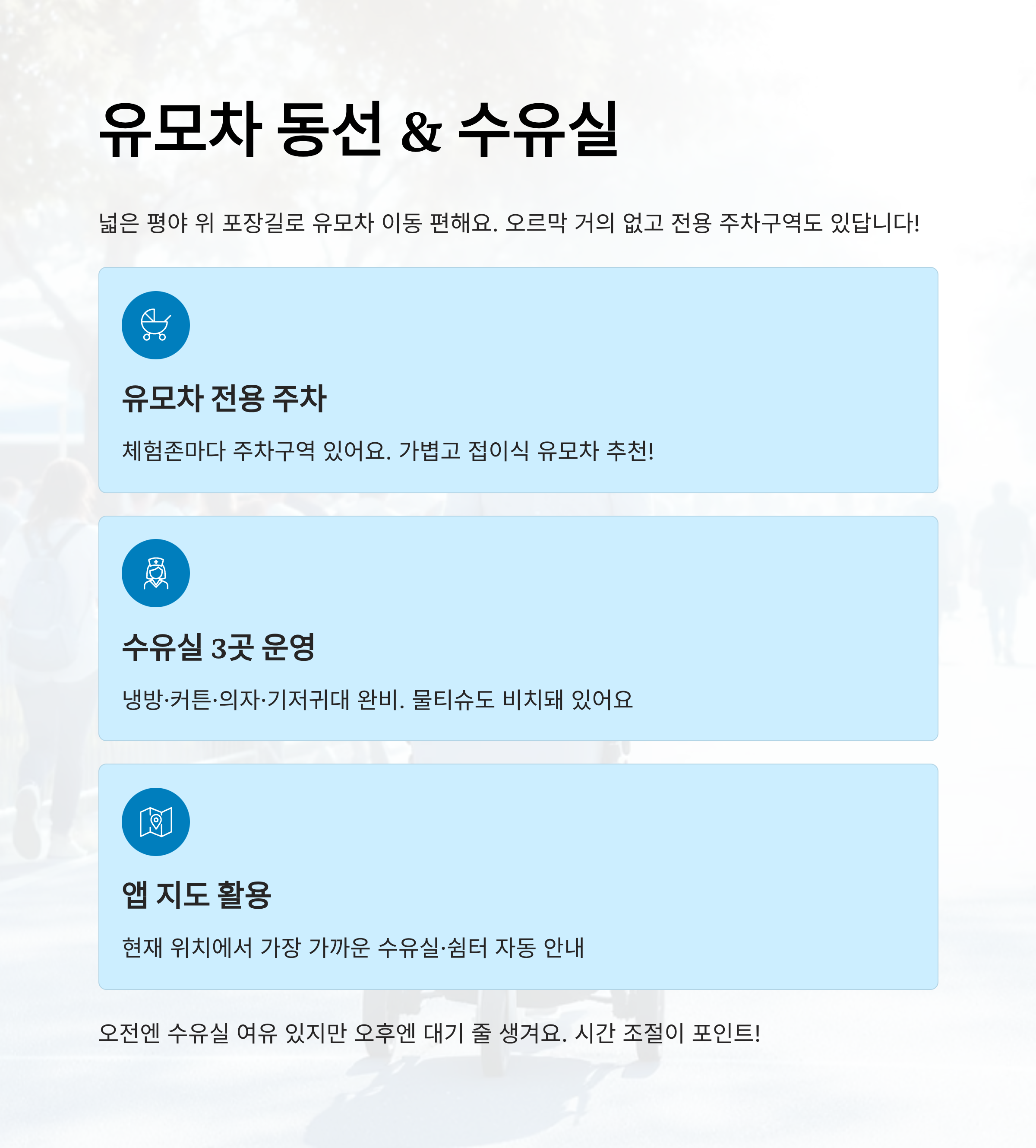 유모차 대여는 따로 되지 않기 때문에 꼭 개인 유모차를 챙겨오셔야 해요. 바구니나 캐리어형은 길이 좁은 구간에서 불편할 수 있으니, 가볍고 접이식 유모차가 좋아요!