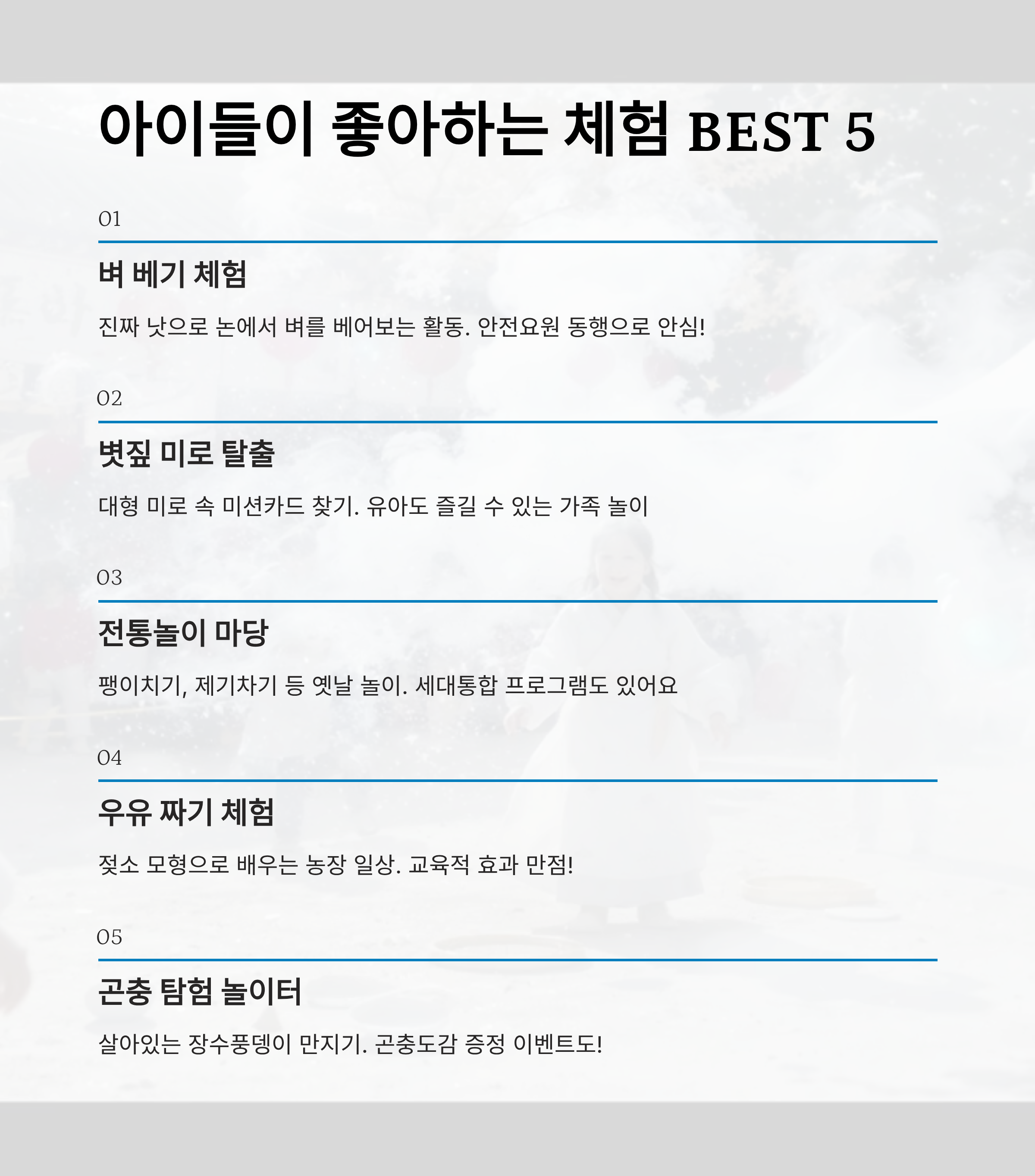 | 볏짚 미로 | 전 연령 | 20분 | 상시 운영 | 무료 |